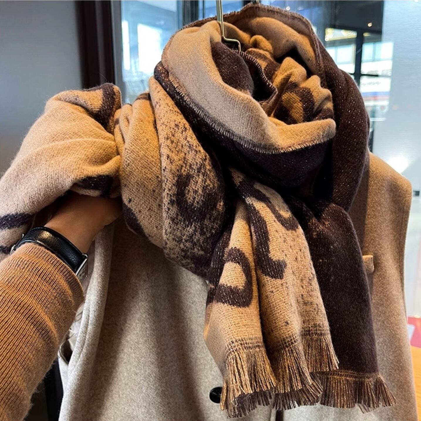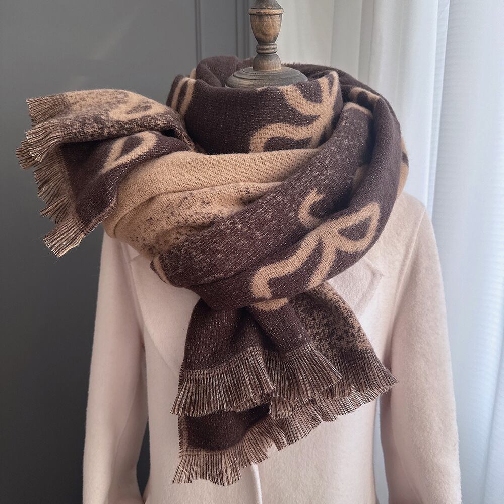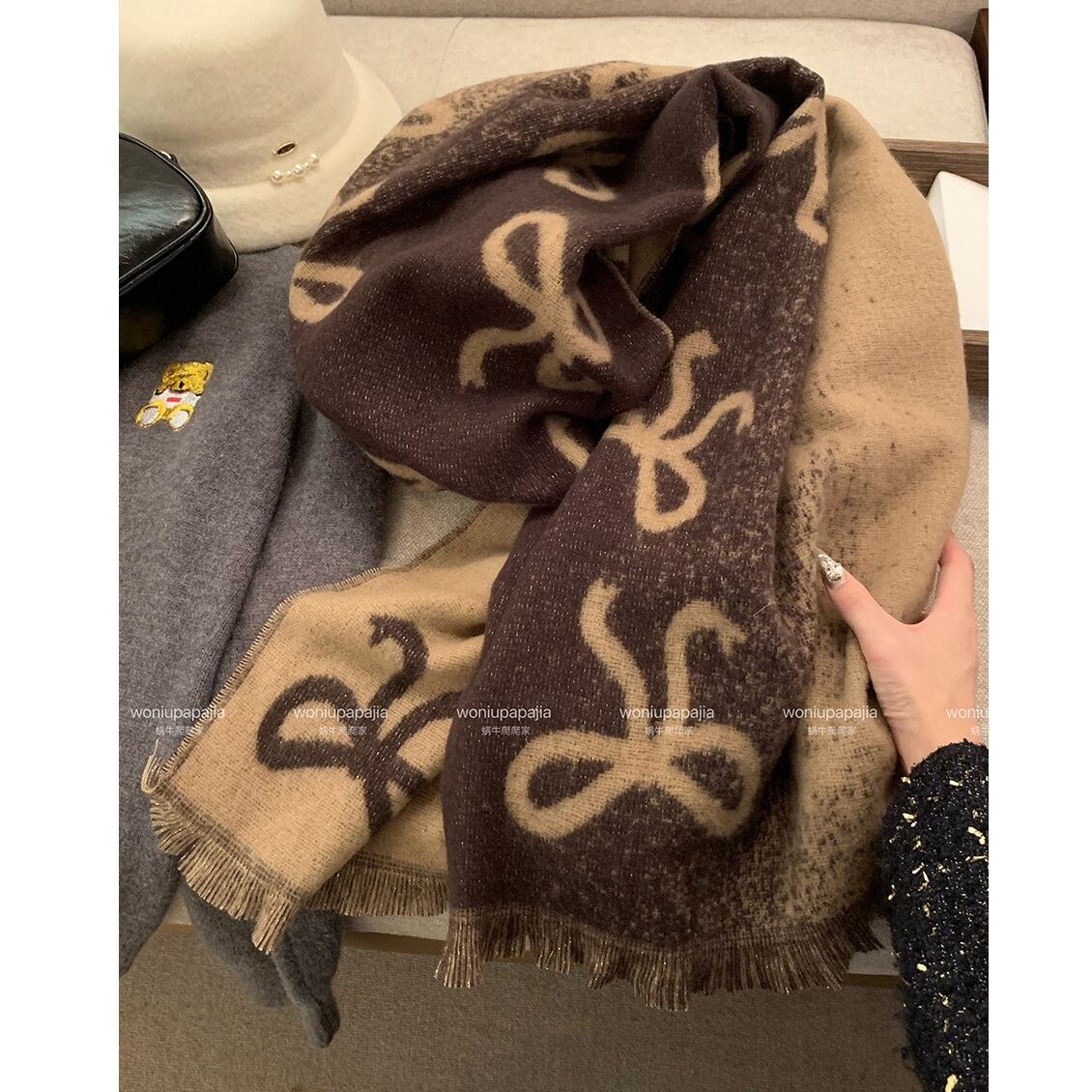 リボンモチーフとカラーグラデーションがポイントのワイドマフラー・ストールです。巻き方や柄の出し方によって雰囲気がかわり、スタイルに合わせてアレンジが楽しめます。少し肌寒い時に首に巻いたり、羽織ったり、ひざ掛けとしてもお使いいただけます。空調の強いオフィスや旅行先に1枚あると便利なアイテムです。肌ざわりの良いイミテーションカシミアを使用しており、お肌の弱い方にもおすすめです。