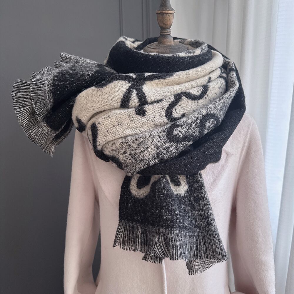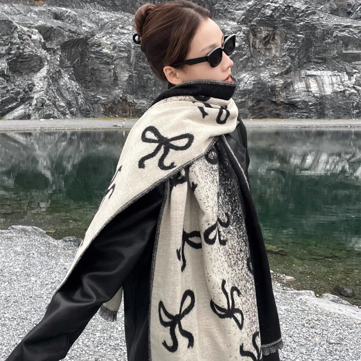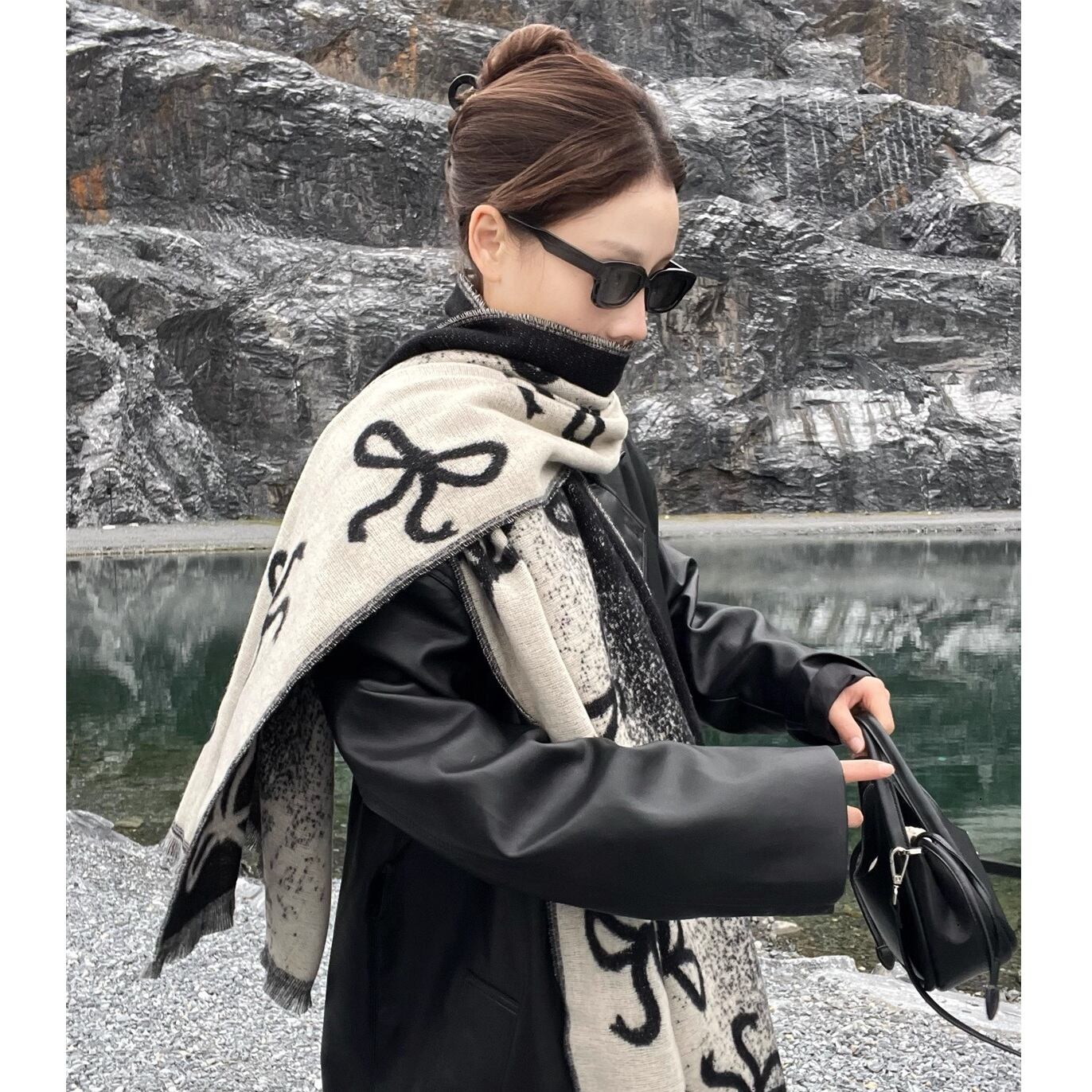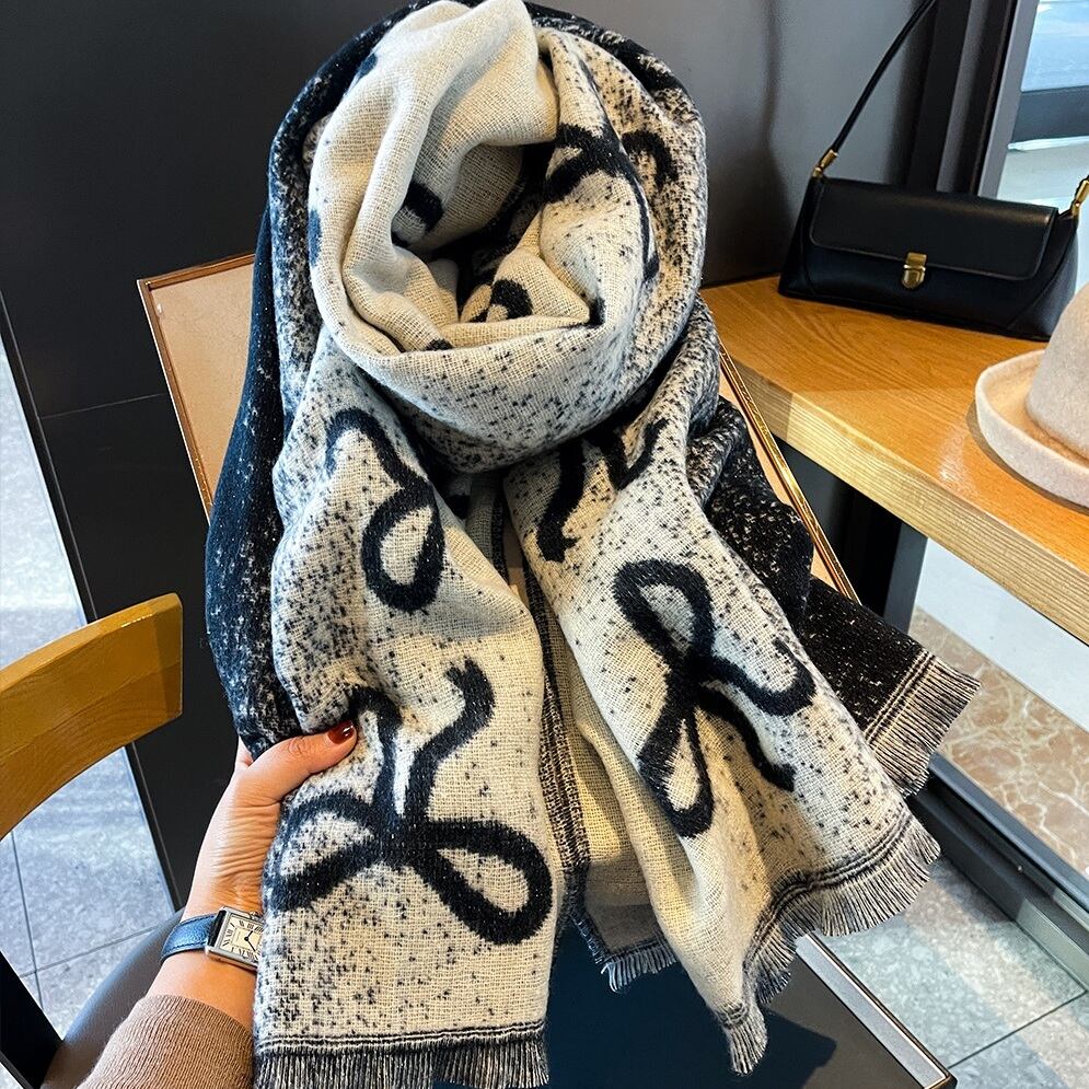 リボンモチーフとカラーグラデーションがポイントのワイドマフラー・ストールです。巻き方や柄の出し方によって雰囲気がかわり、スタイルに合わせてアレンジが楽しめます。少し肌寒い時に首に巻いたり、羽織ったり、ひざ掛けとしてもお使いいただけます。空調の強いオフィスや旅行先に1枚あると便利なアイテムです。肌ざわりの良いイミテーションカシミアを使用しており、お肌の弱い方にもおすすめです。
