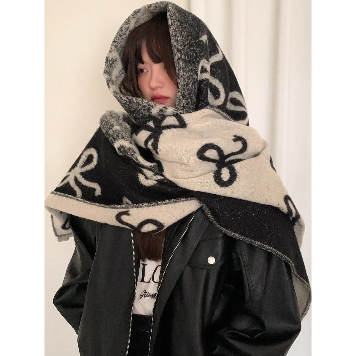 リボン+グラデーション ワイドマフラー・ショール ブラック WT00072