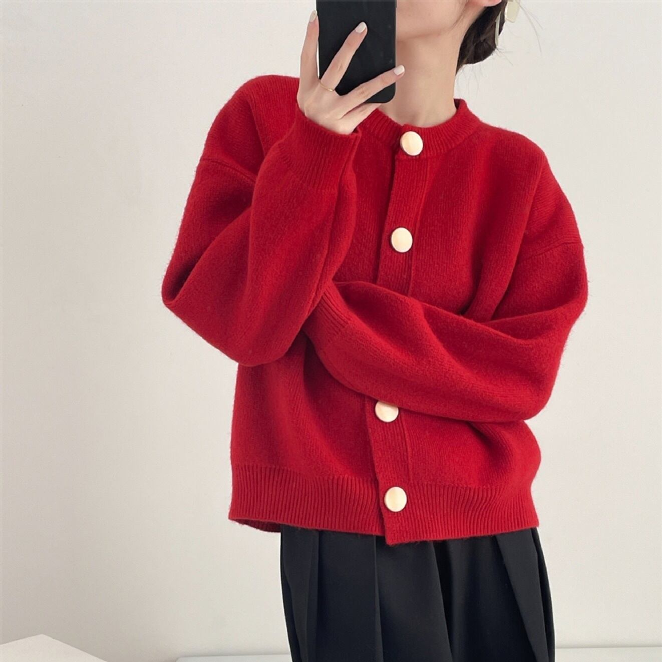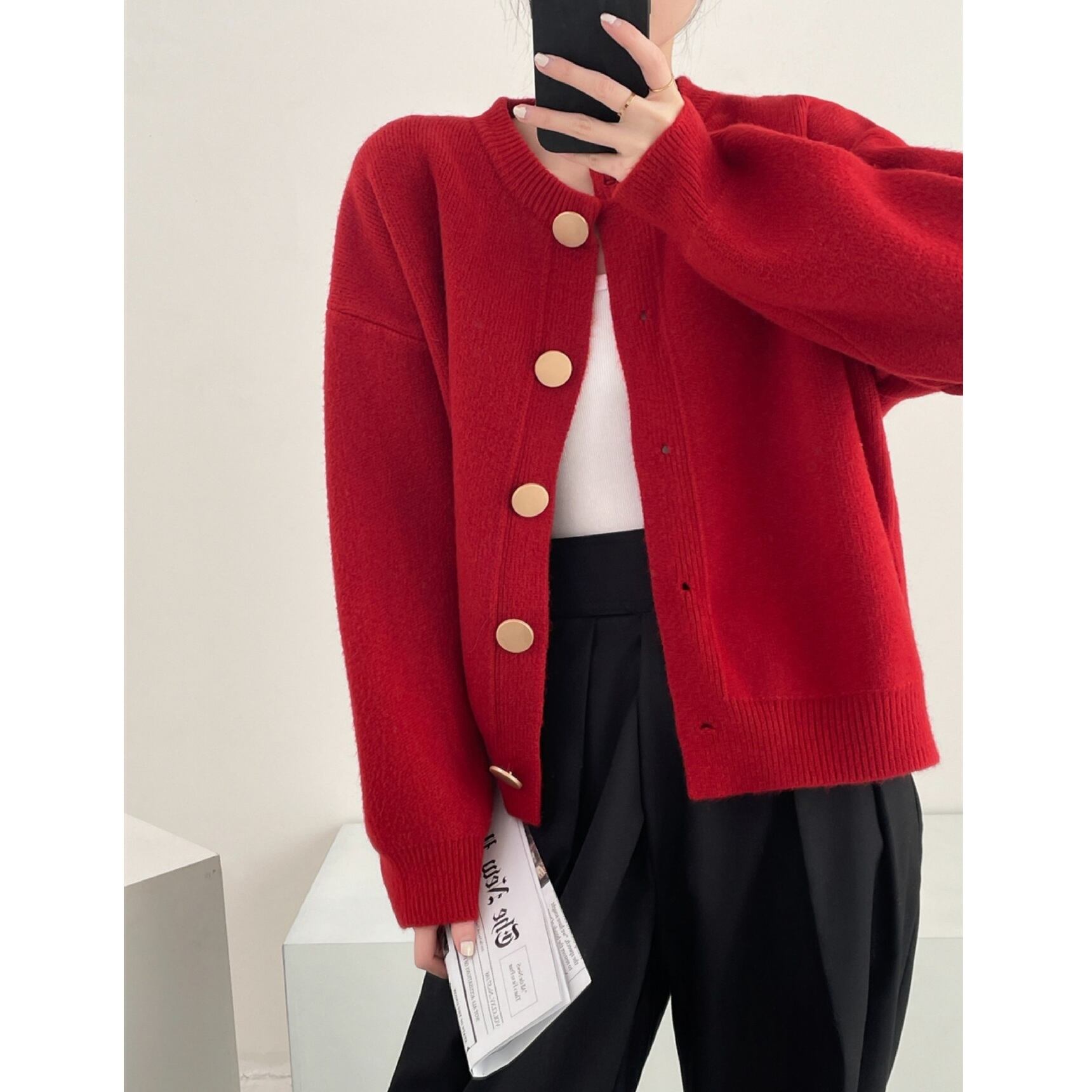 メタルサークルボタン クルーネック ニットカーディガン レッド NI00441
