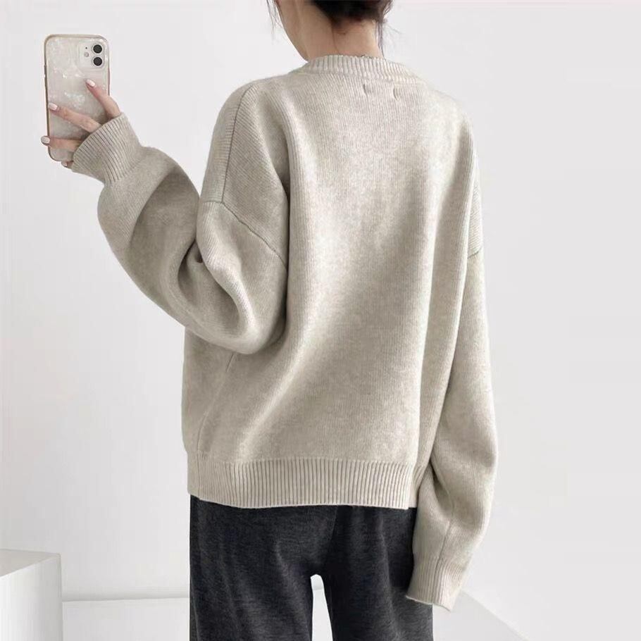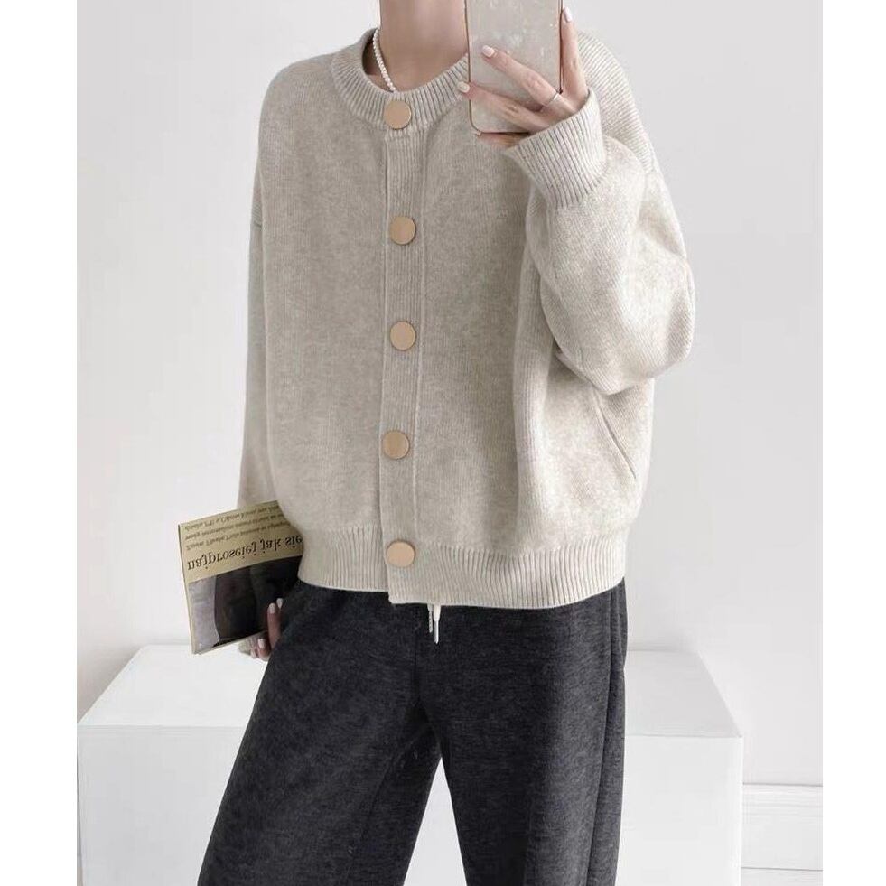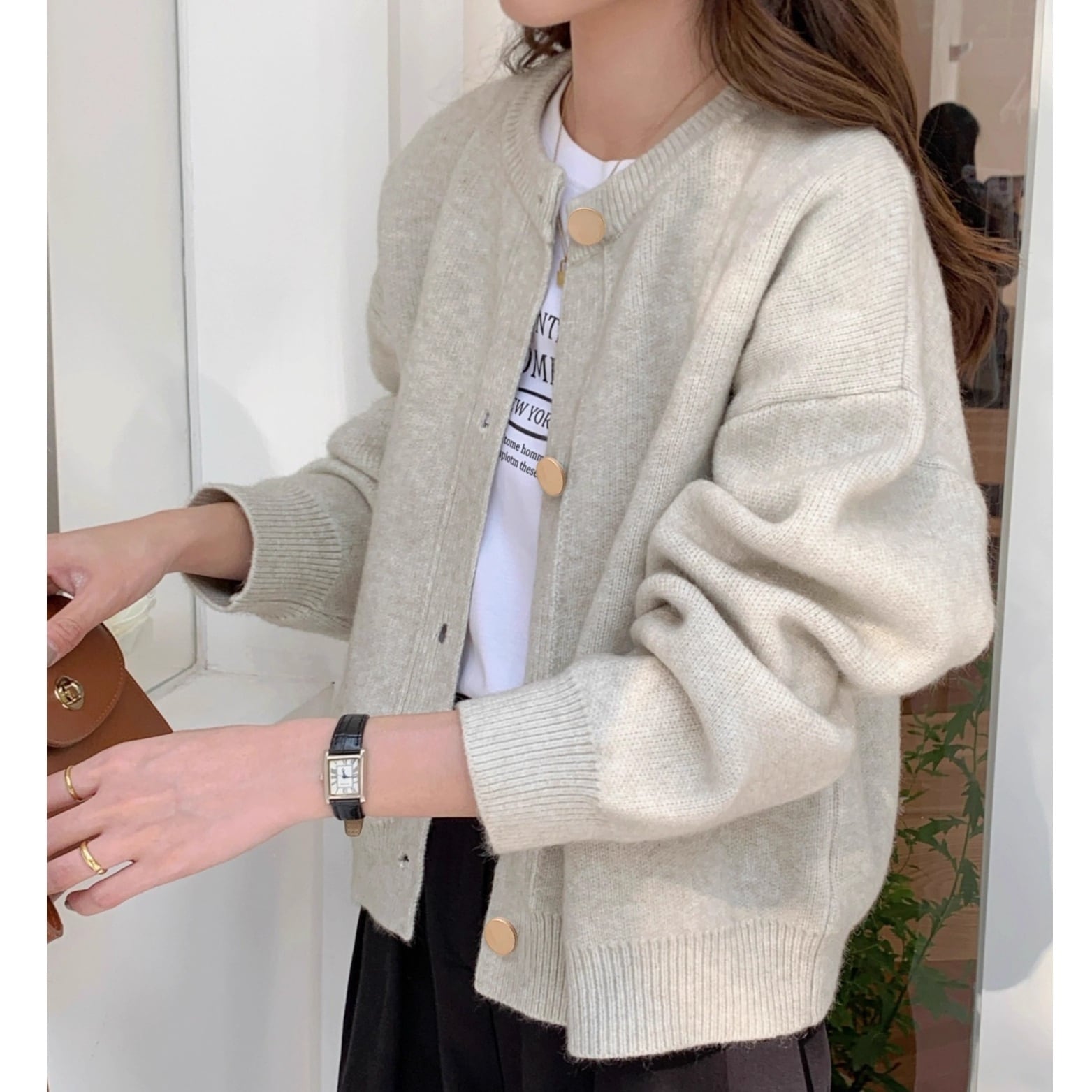 メタルサークルボタン クルーネック ニットカーディガン ライトグレー NI00439