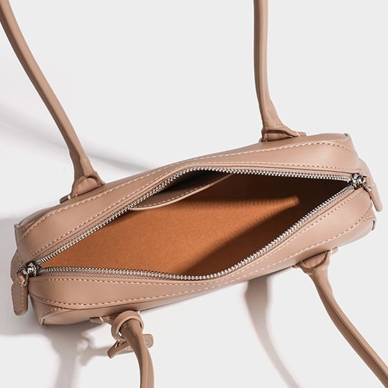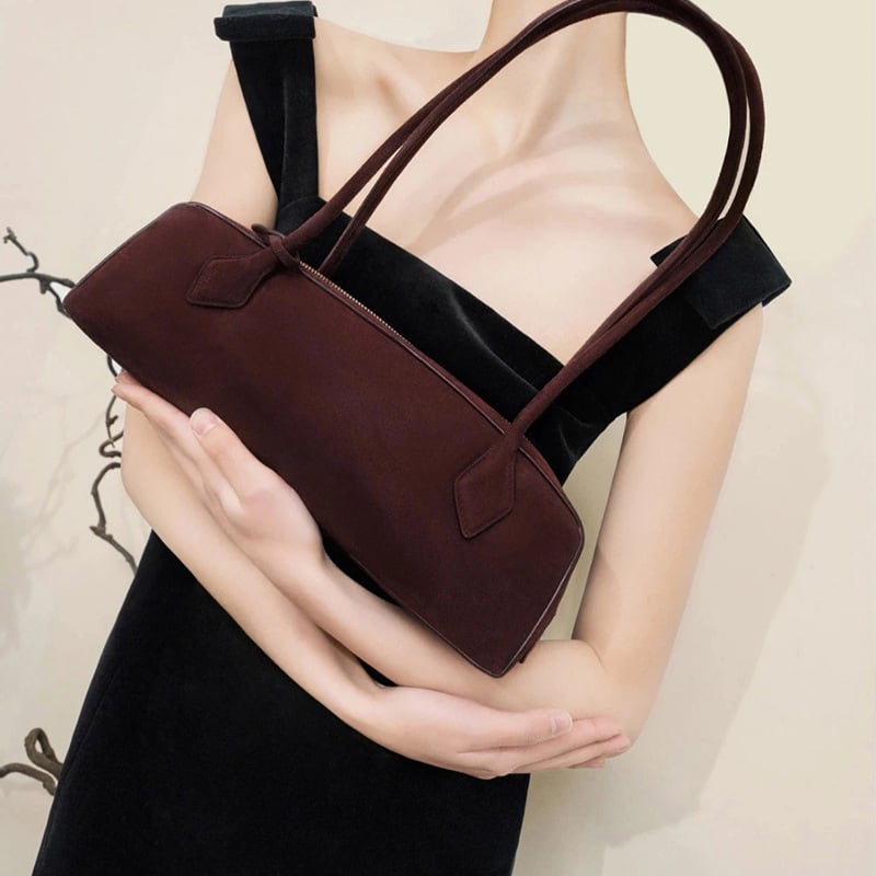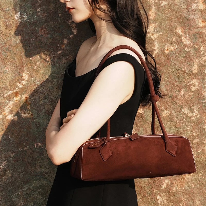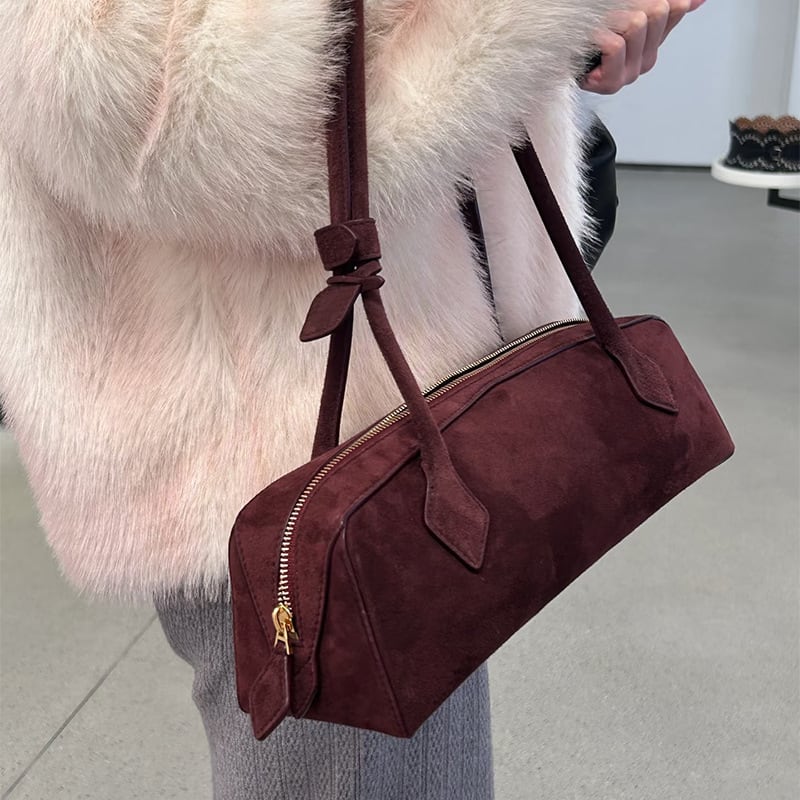 上質なリアルスウェードを使用した、シンプルなデザインのボックスハンドバッグです。長めのストラップでハンドバッグとしてもショルダーバッグとしても、2wayにお使いいただけます。マチも広く見た目よりも荷物を収納できます。コーデのアクセントにおすすめのバッグです。リアルスウェードの割にお求めやすいプライスも魅力です。
