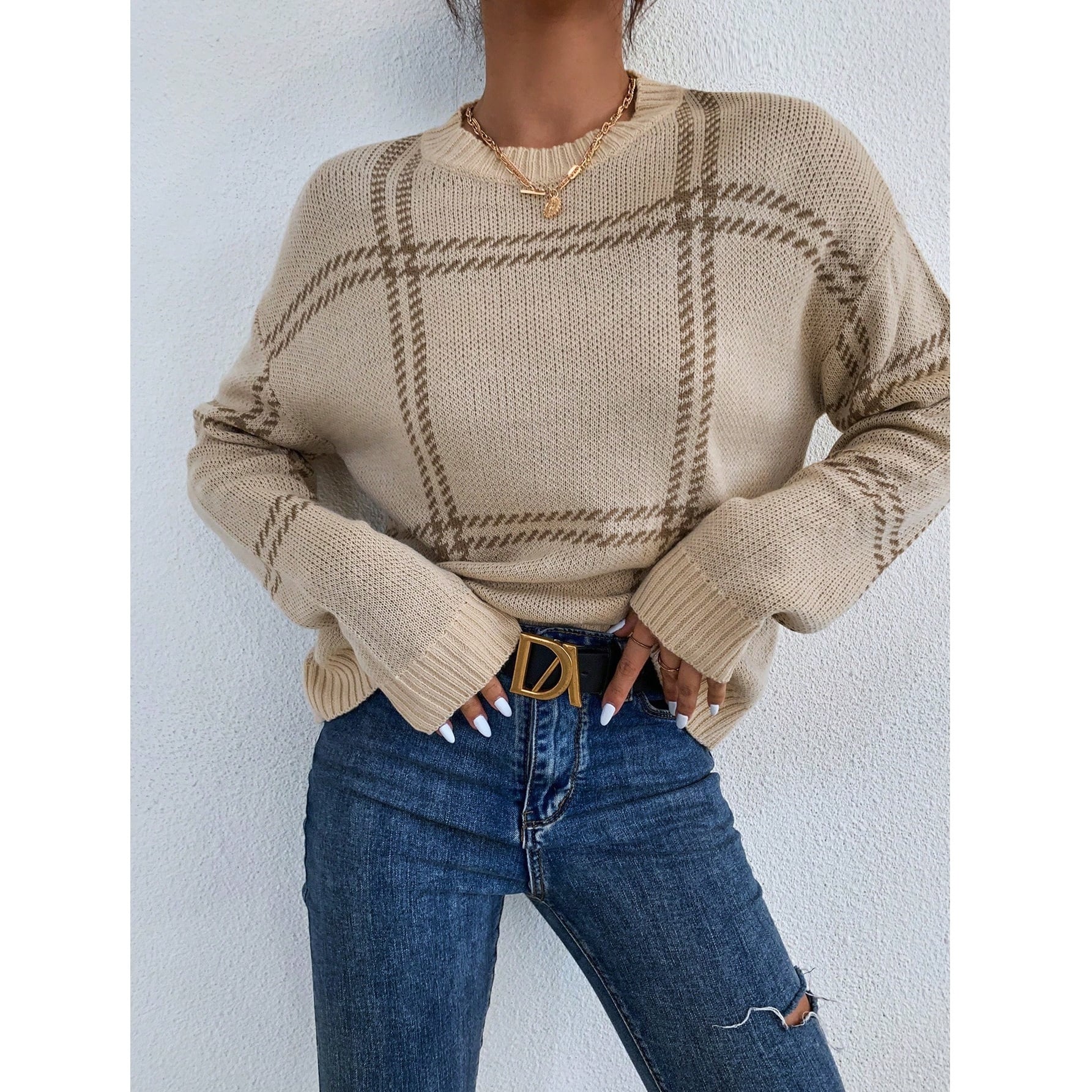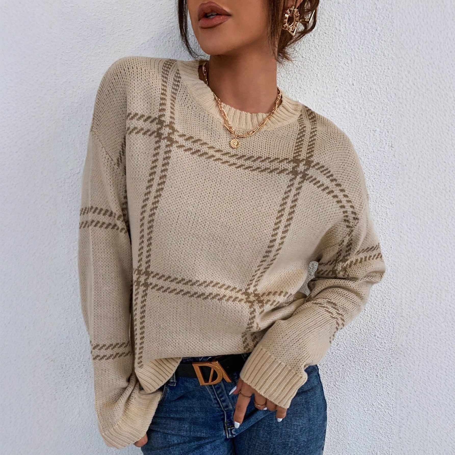 カラーブロックチェック クルーネックニットセーター ベージュ/ブラウン NI00454