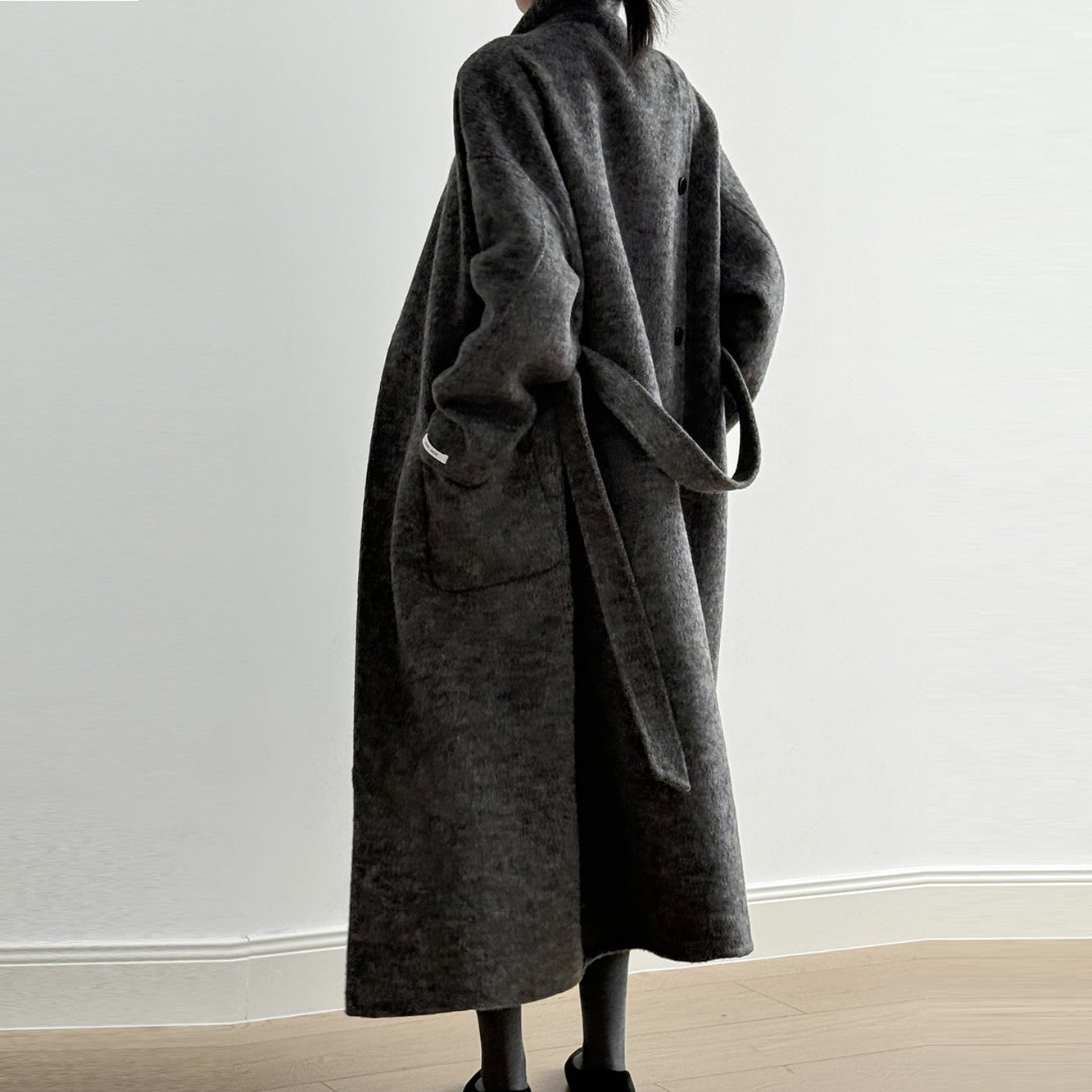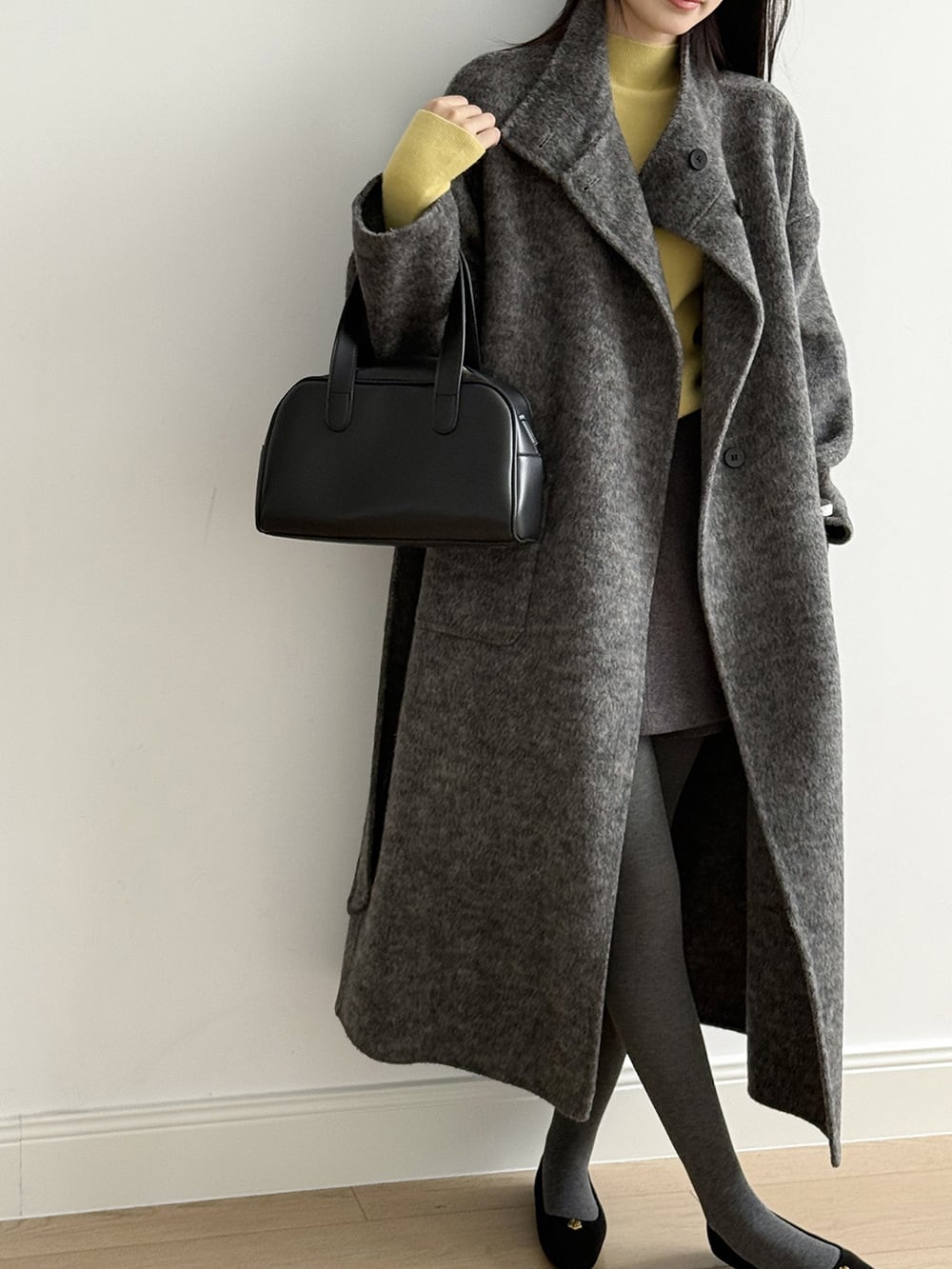 スタンドカラー ウエストベルト付き ウールロングコート ダークグレー CT00156