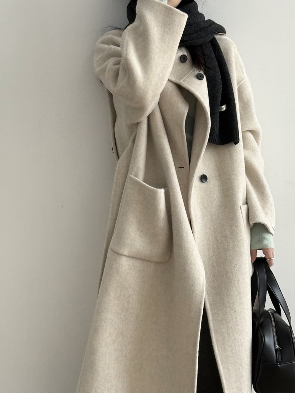 スタイリッシュなウールのスタンドカラーロングコートです。一見シンプルなデザインですが、袖口と背中の布地の切替やボタンアレンジがアクセントになっています。ソフトなウールの質感が織りなすゆるやかなシルエットでフェミニンなイメージにまとまります。ボトムスを選ばず、さらっと羽織るだけでハイセンスなスタイルが完成します。共布のウエストベルトでスタイリングの幅も広がります。通勤用コートとしてもおすすめです。