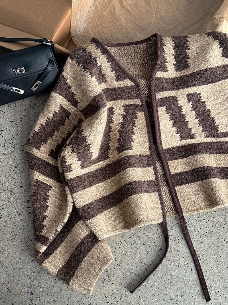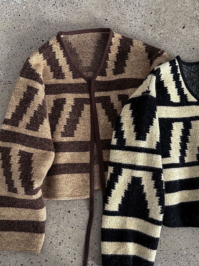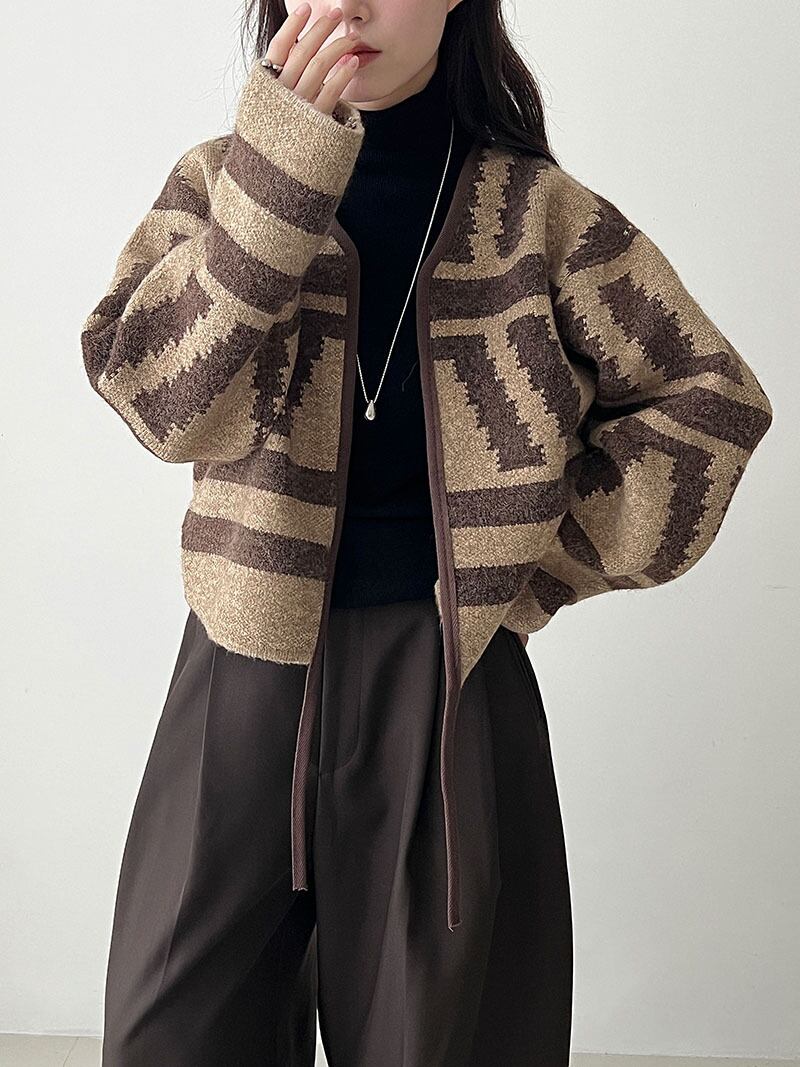 ユニークなトライバルパターンがポイントのノーカラージャケットです。個性的ながら使いやすいフェミニンなシルエットとデザインです。ボトムスを選ばず、幅広いスタイリングが楽しめます。スカート、パンツ、ワンピースやサロペット、どんなアイテムと合わせても、スタイリッシュなスタイリングが完成します。