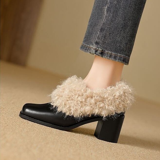 カーリーエコファー レザーヒールパンプス ブラック SH00400