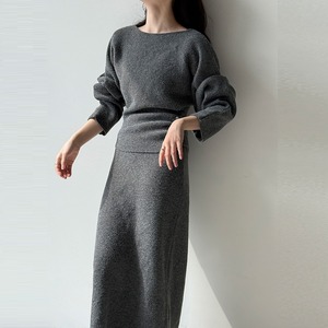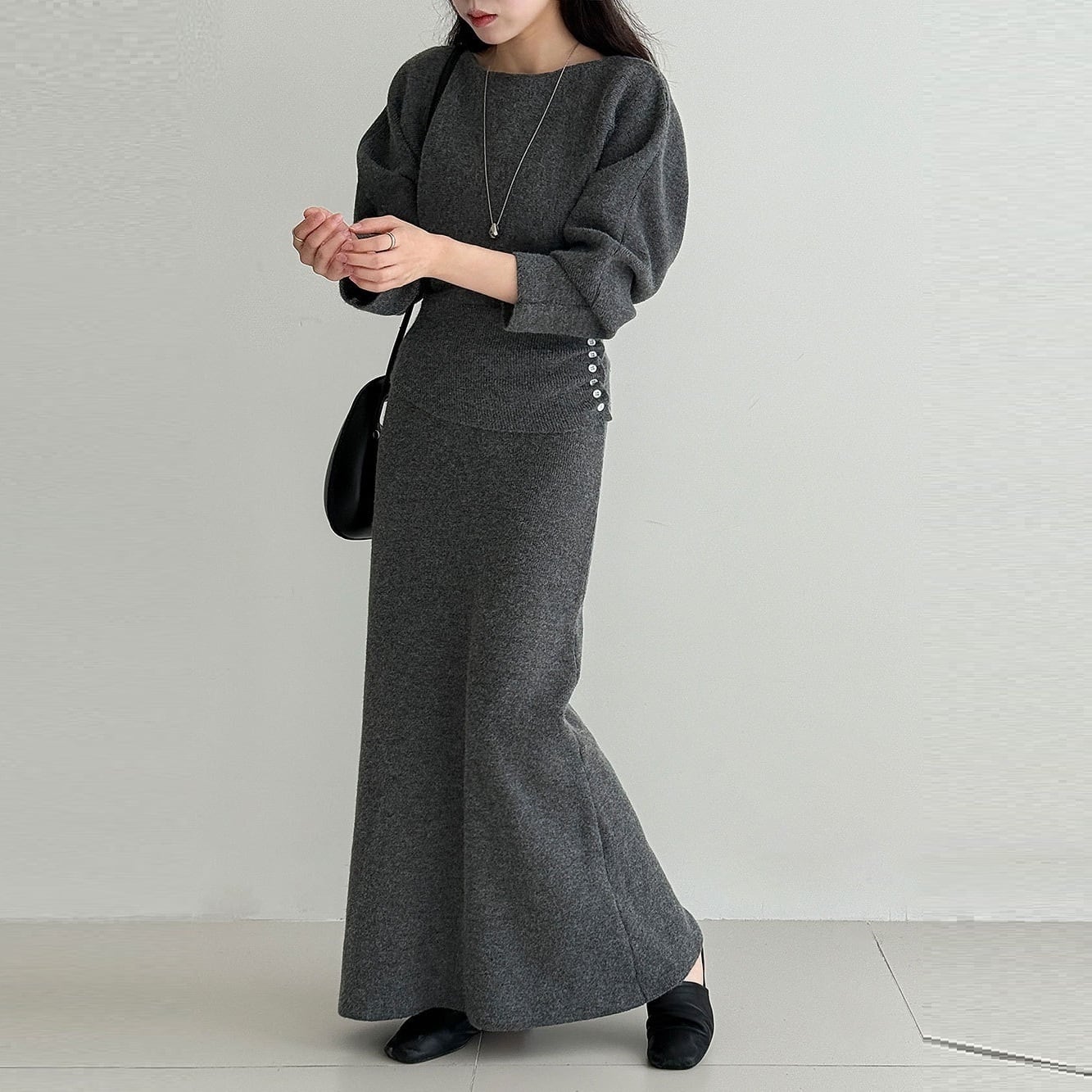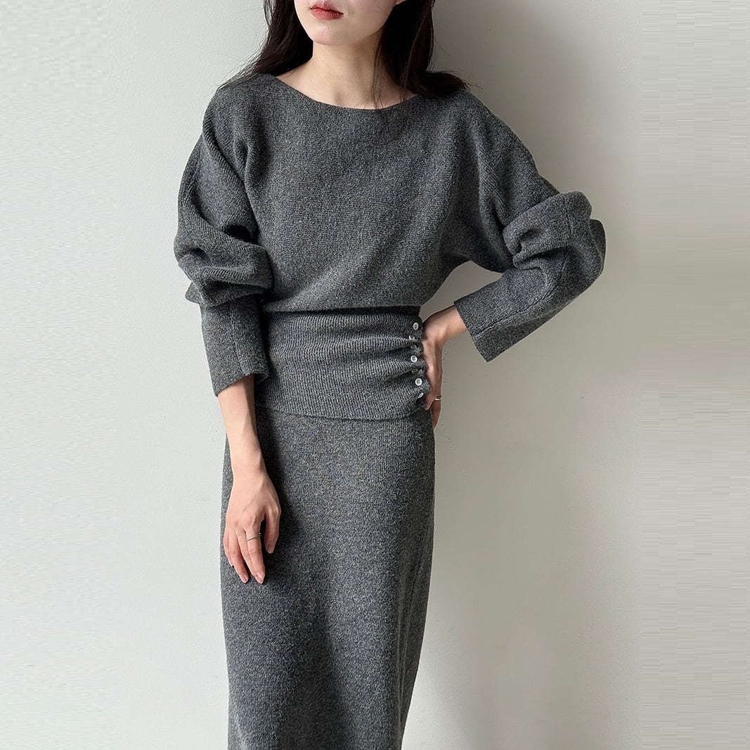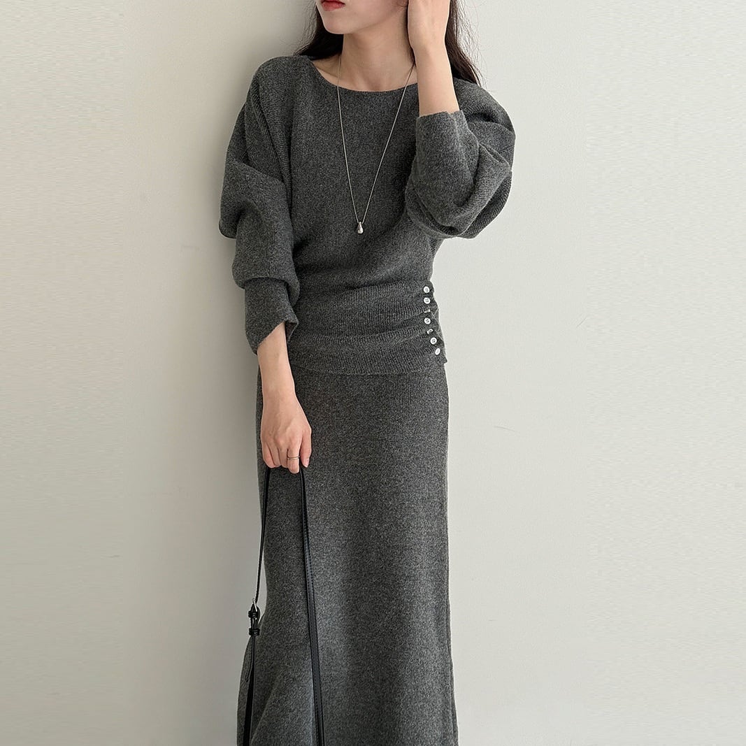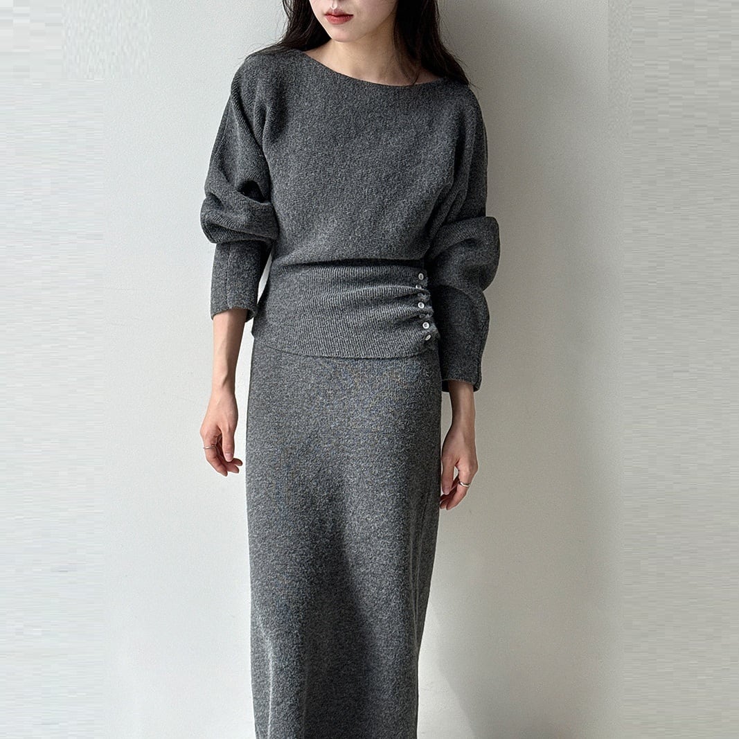 サイドボタンシャーリング ボートネックニット+ニットロングスカート グレー SU00089