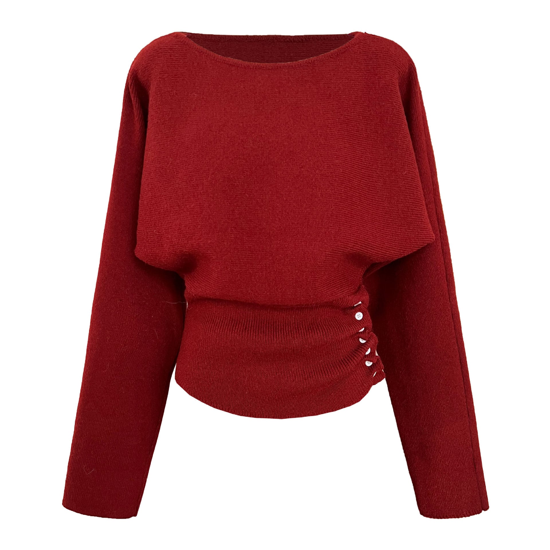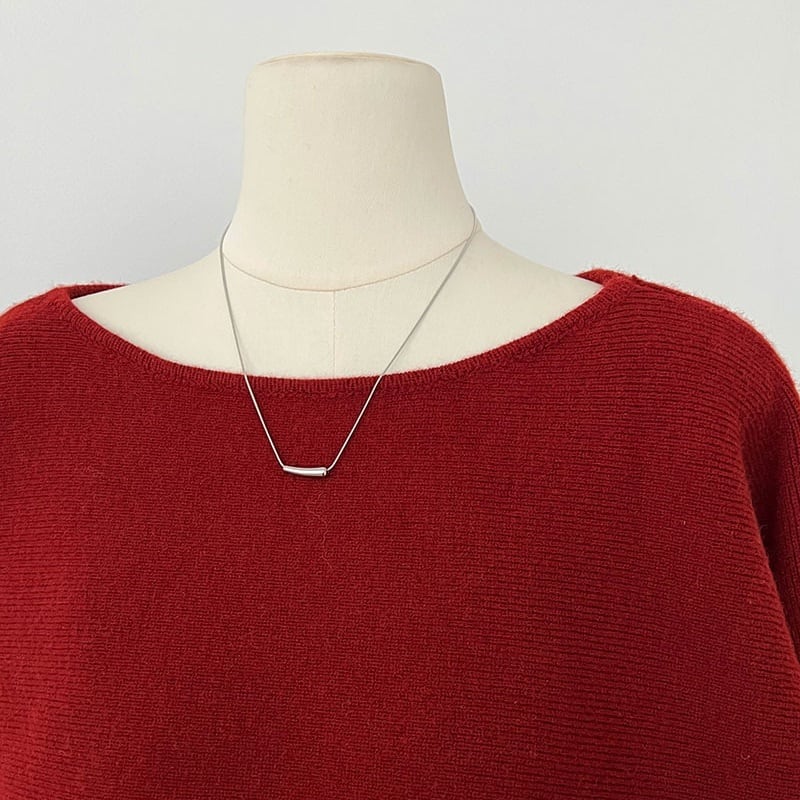 ボタンをアレンジしたサイドのシャーリングがポイントのニットとロングスカートのセットアップです。ボートネックとサイドボタンのシャーリング、タイトなロングスカートが女性らしいシルエットを演出します。ニットとスカート、それぞれ単体ずつでも使いやすいデザインです。