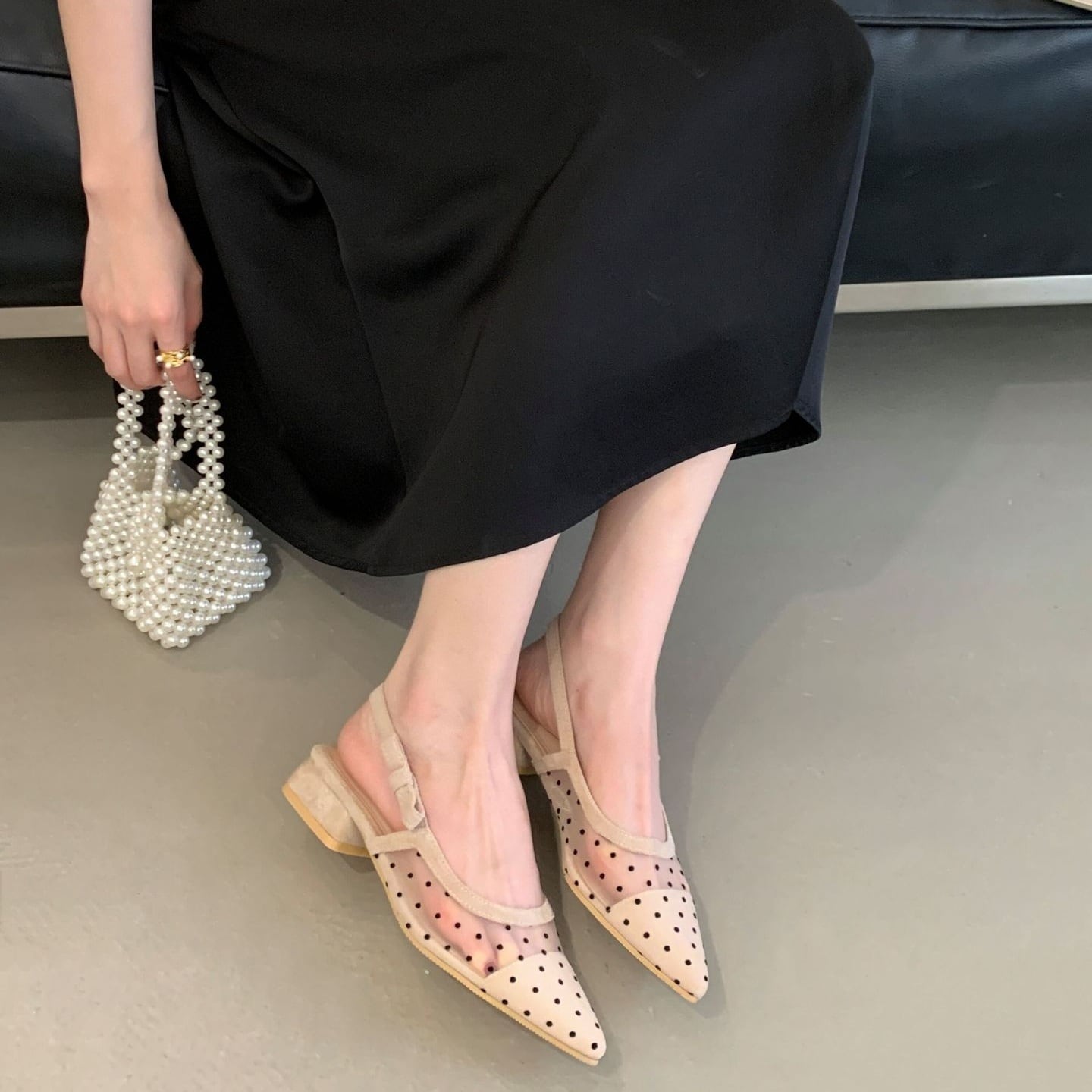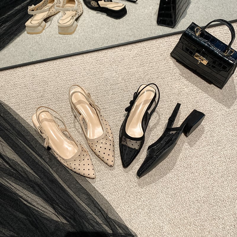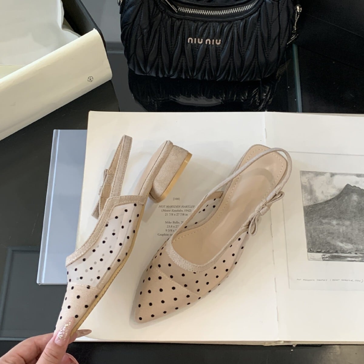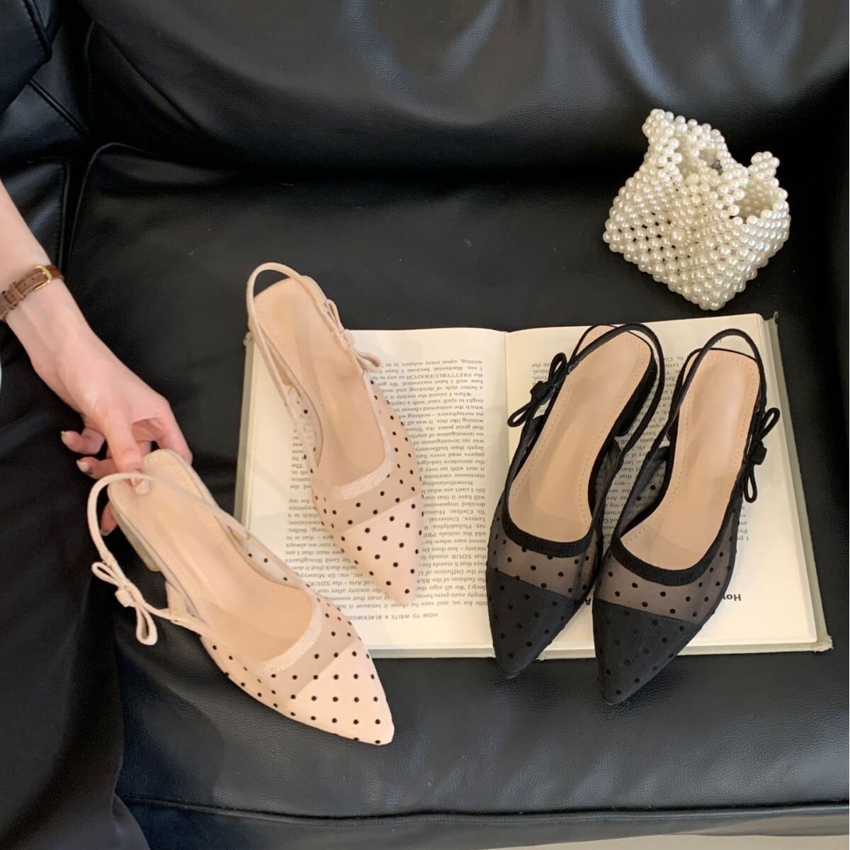 シアーポルカドット(水玉)スリングバック+サイドリボン ヒールパンプス ベージュ SH00408