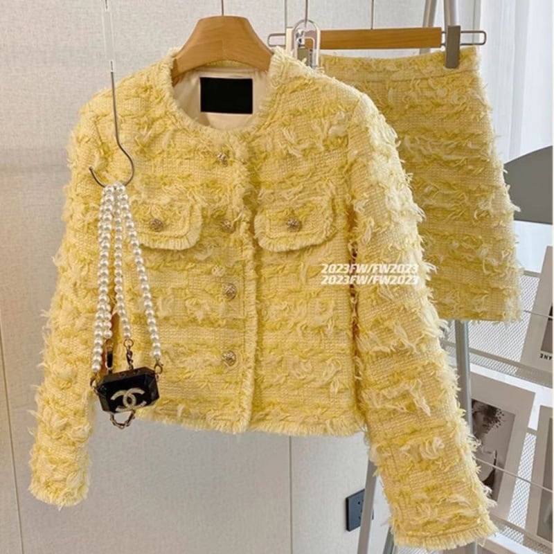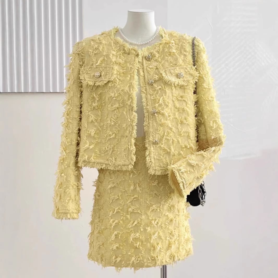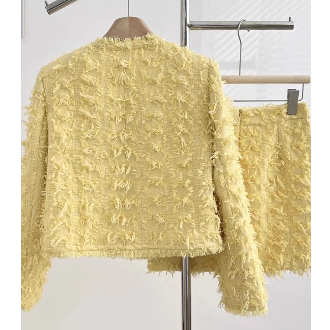 シャギーツイード ノーカラージャケット+ミニスカート セットアップ イエロー SU00091