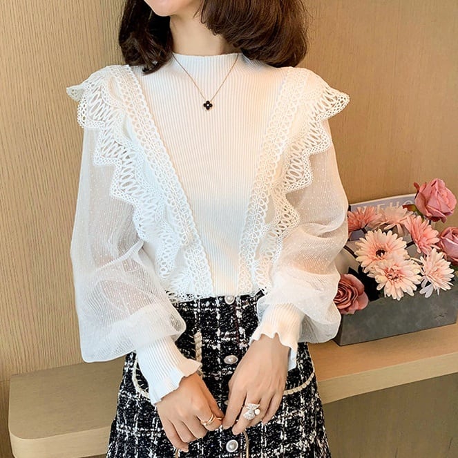 レーシーなニットとシアースリーブのコンビネーションがフェミニンなトップスです。デニム+スニーカーと合わせてもカジュアルになりすぎず、フェミニンな雰囲気に仕上がります。チュールスカートなどと合わせてスイートに、タイトスカート+ヒールパンプスでエレガントにも、1年を通して幅広いコーデが楽しめます。