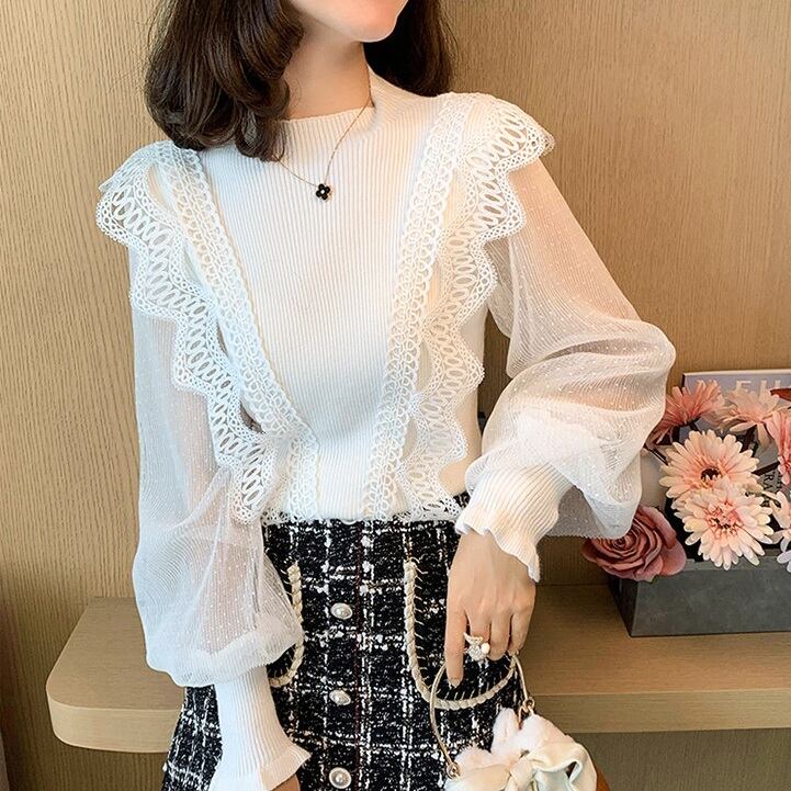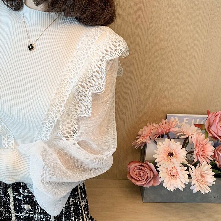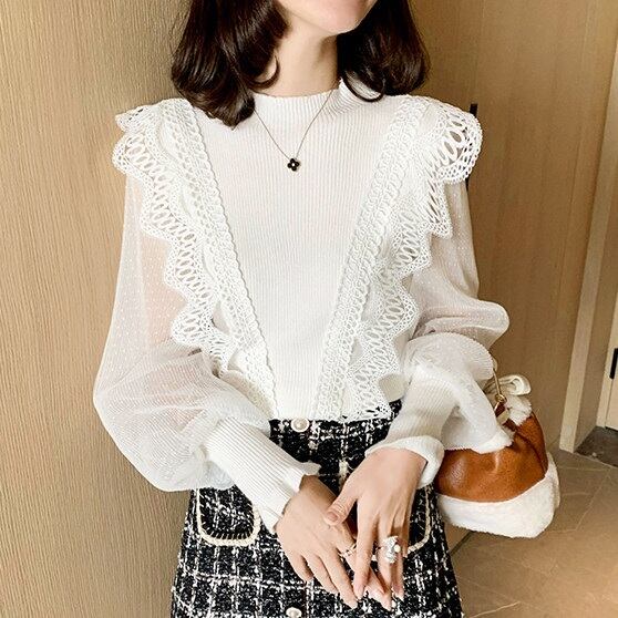 シアースリーブ+レースコンビネーション ニットトップス ホワイト NI00460