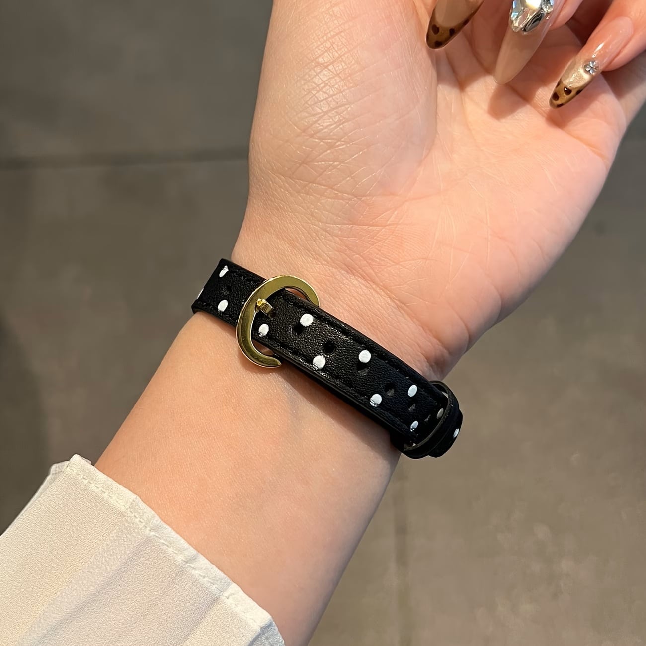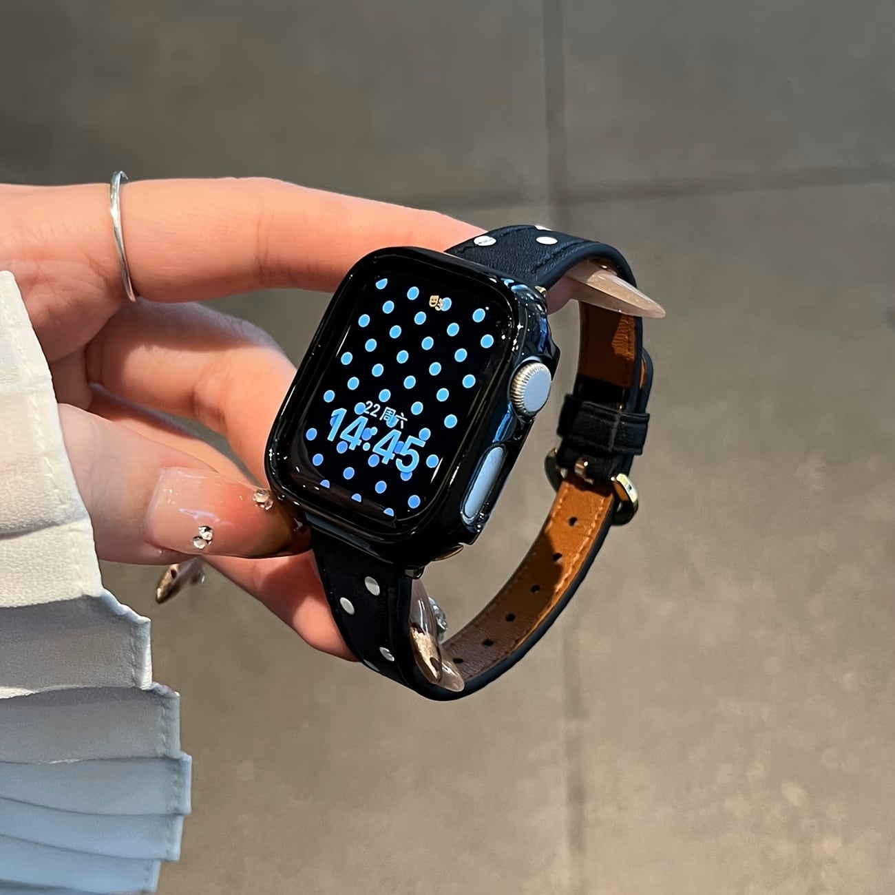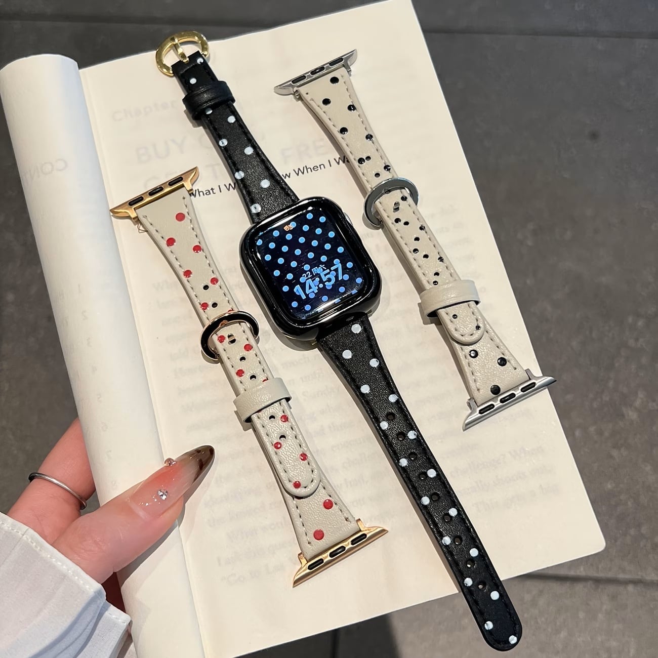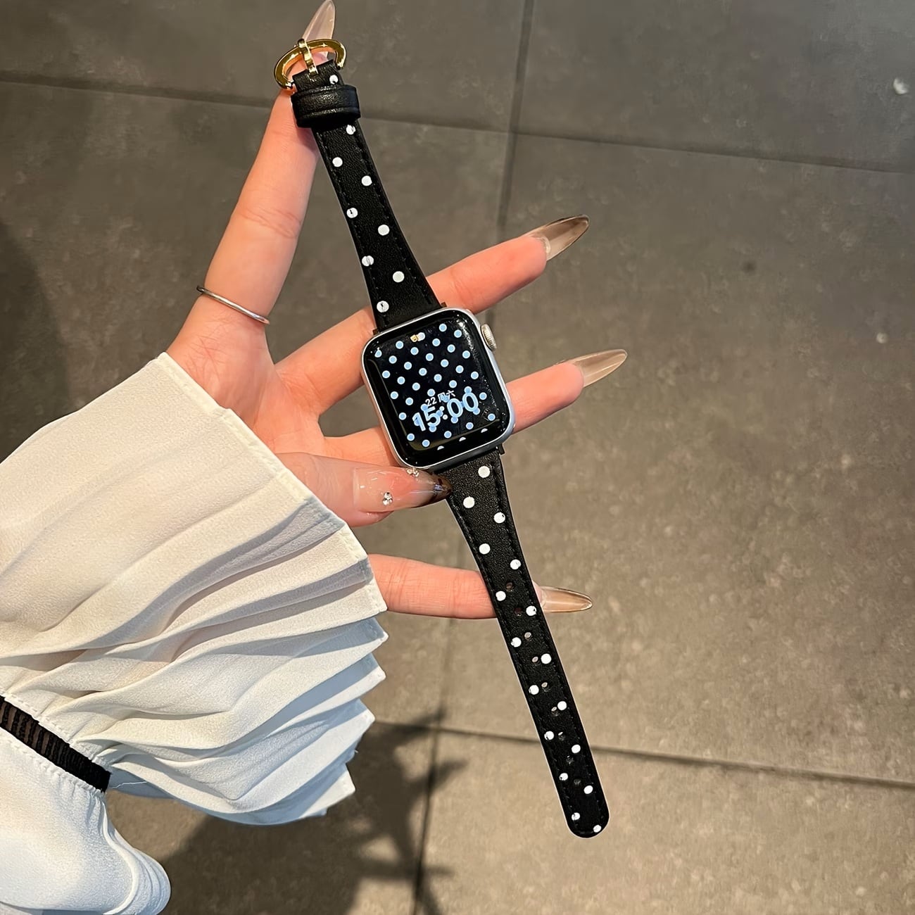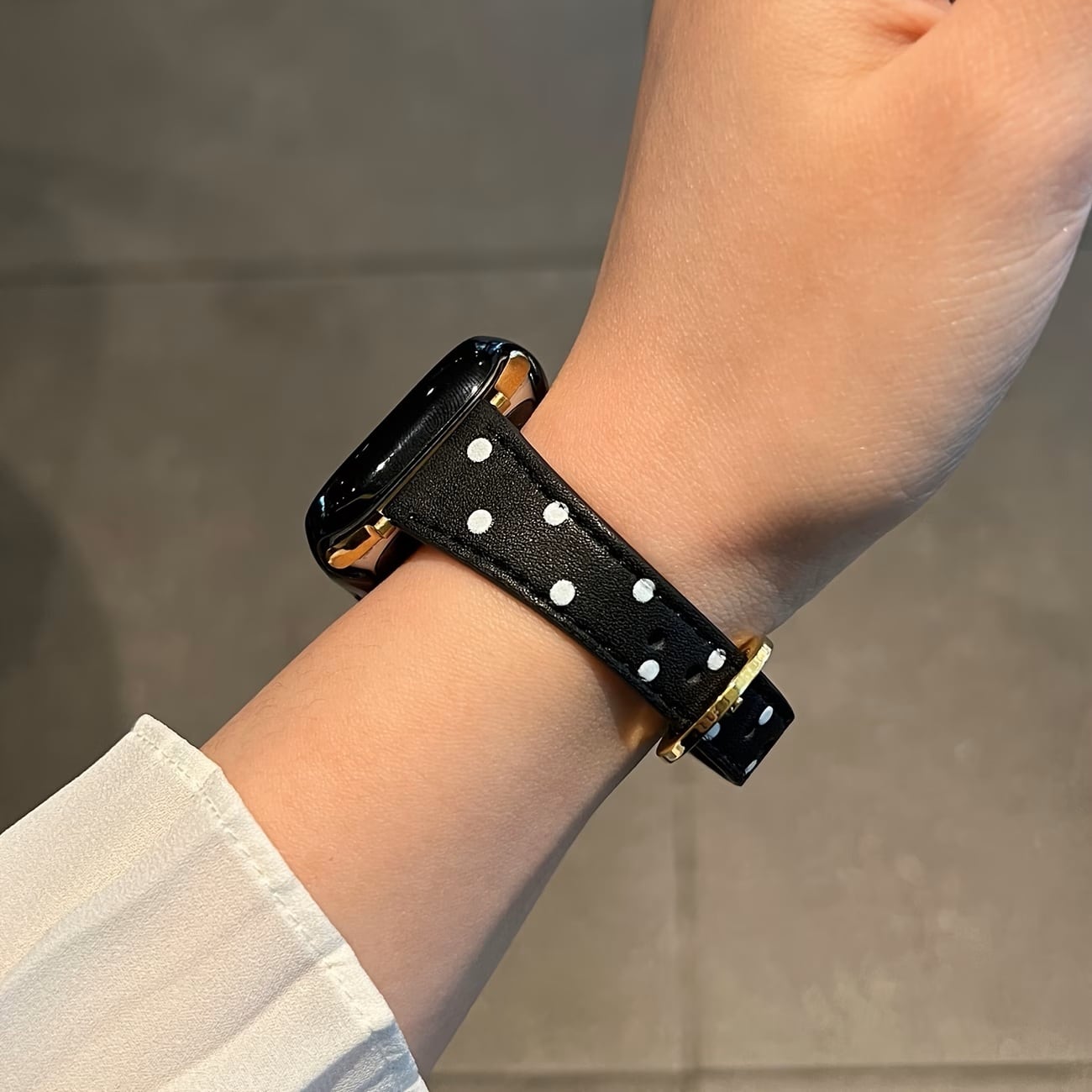 細かい水玉の入ったパテントレザーのApple Watchベルトです。上質なレザーを使用したシンプルなデザインで、スマートウォッチを上品にスタイリングできます。ブレスレット感覚でベルトを着け替えたくなる、オシャレなデザインです。