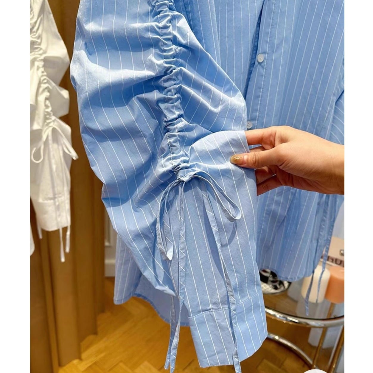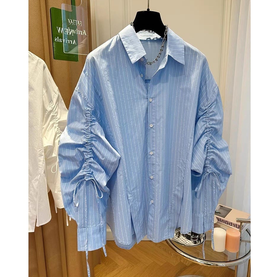 袖のリボン付きのシャーリングがポイントのストライプのデザインシャツです。シャーリングの加減で袖のシルエットのイメージがかわります。身頃はオーバーサイズでゆったりとしたボリューム感です。カジュアルからエレガントスタイルまで幅広くお使いいただけます。