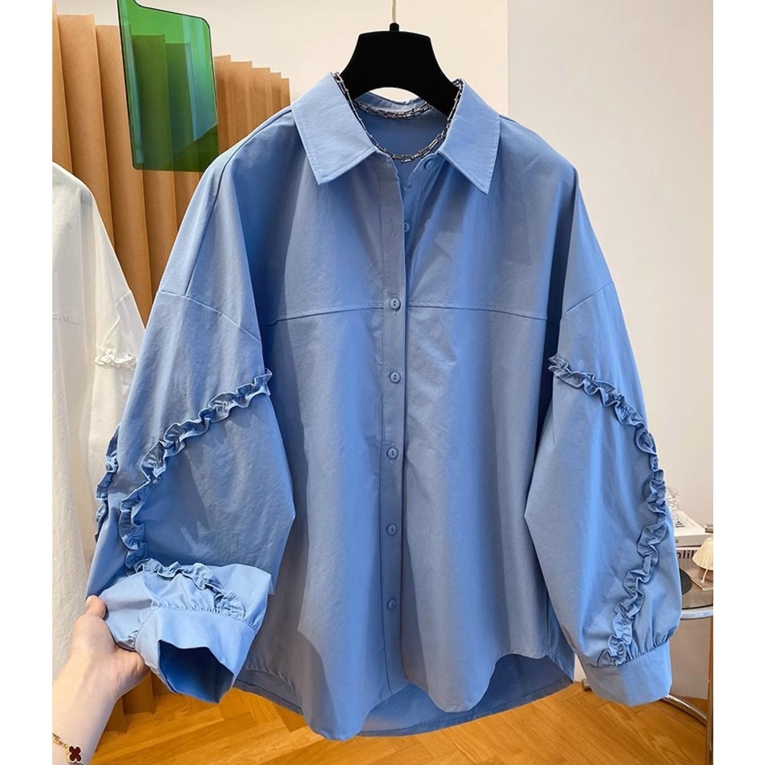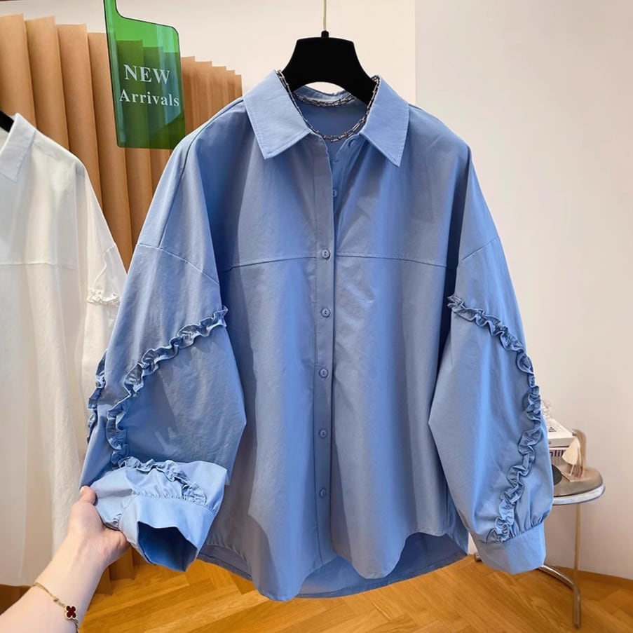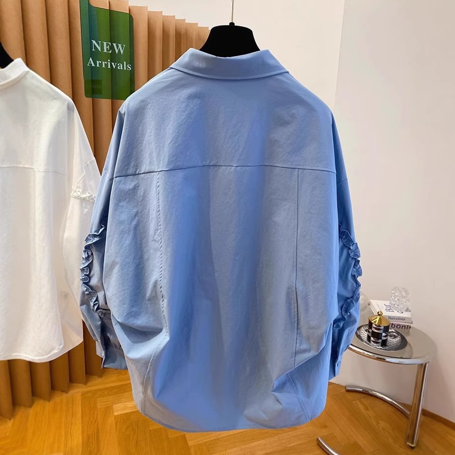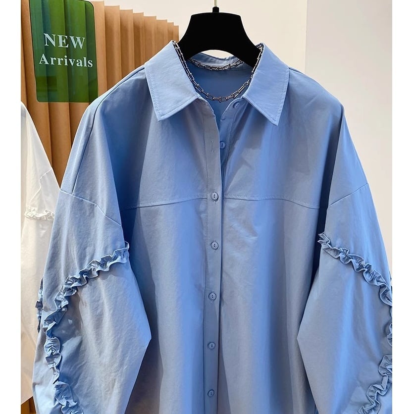 袖のフリルライニングポイントとボディーの切替がポイントのデザインシャツです。オーバーサイズでゆったりとしたシルエットが楽しめます。カジュアルからエレガントスタイルまで幅広くお使いいただけます。