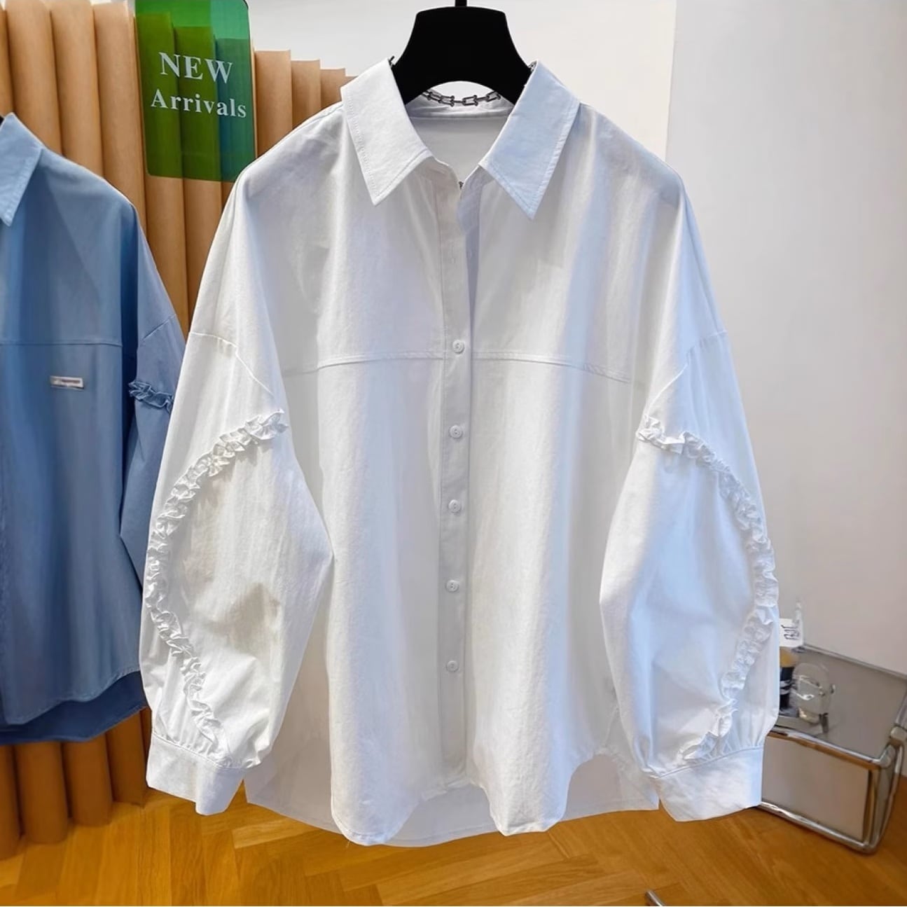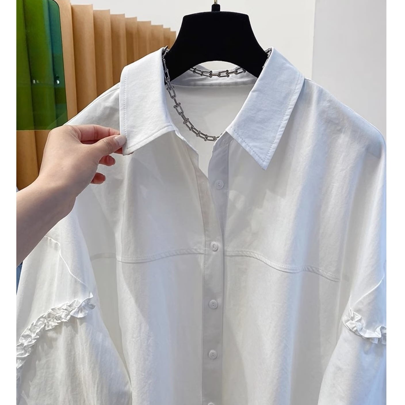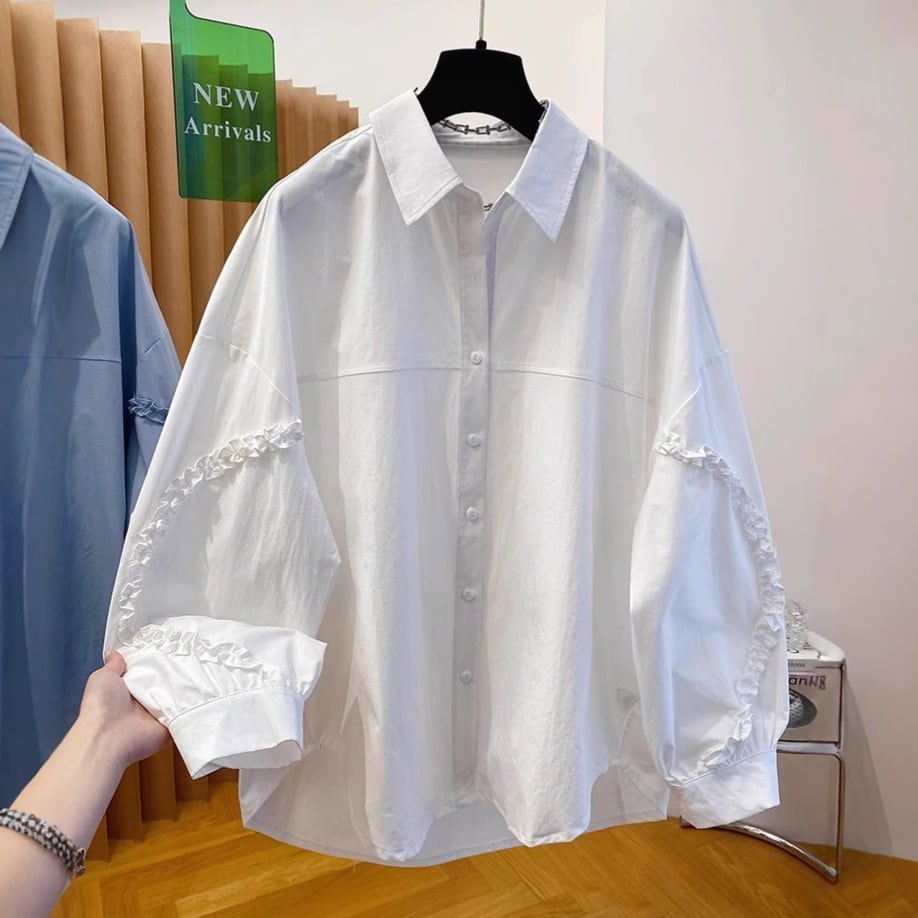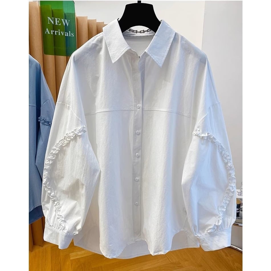 袖のフリルライニングポイントとボディーの切替がポイントのデザインシャツです。オーバーサイズでゆったりとしたシルエットが楽しめます。カジュアルからエレガントスタイルまで幅広くお使いいただけます。