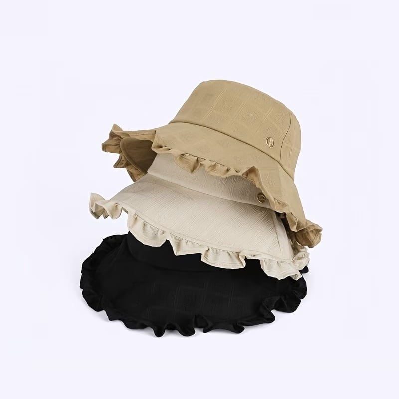 フリルのパイピングとストラップがフェミニンなバケットハットです。アウトドアのイベントや、音楽フェスやライブなどの楽しいイベントだけでなく、デイリーユースにもおすすめのおしゃれなデザインです。日差しも防ぎ、センスアップもでき、小さく収納もできる便利なバケットハットです。夏のコーデのアクセントにおすすめです☆