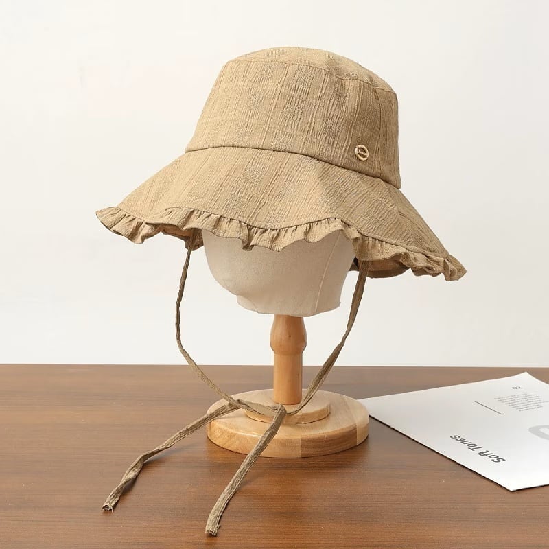 フリルのパイピングとストラップがフェミニンなバケットハットです。アウトドアのイベントや、音楽フェスやライブなどの楽しいイベントだけでなく、デイリーユースにもおすすめのおしゃれなデザインです。日差しも防ぎ、センスアップもでき、小さく収納もできる便利なバケットハットです。夏のコーデのアクセントにおすすめです☆
