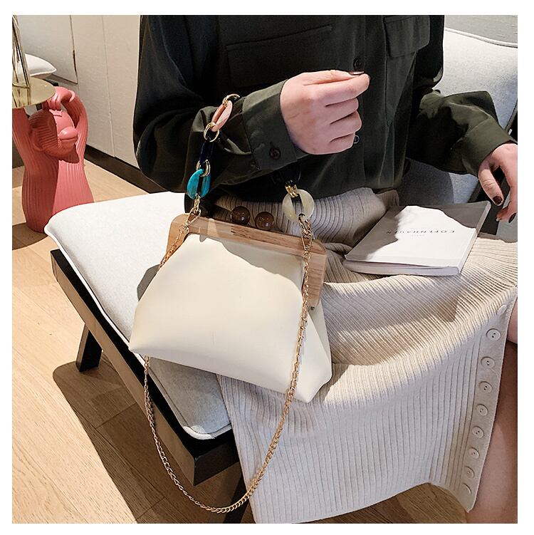 マルチカラーのハンドストラップとウッドフレームが個性的!チェーンを外して、ハンドバッグとして2WAYに使えます。パーティーからデイリーユースまで、幅広いシーンに使えます。