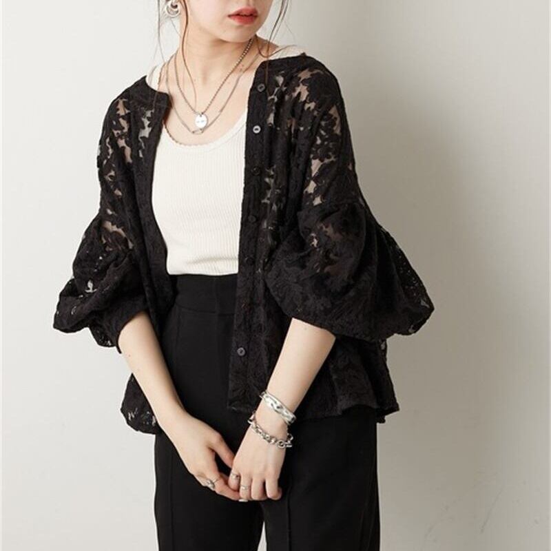 ロマンティックなレースのカーディガンです。ラグラン袖なので、甘くなりすぎず、合わせやすいアイテムです。冷房が効いている夏の室内や、春や秋口まで重宝する1枚です。