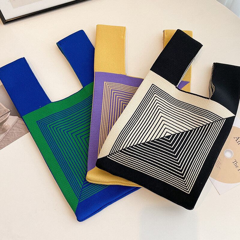 人気のニットバッグに、ジオメトリック柄が登場です。カラーリングもスタイリッシュで、アクセントにおすすめです。軽く、シワにならず、小さくまとめられて旅行先でも便利です。