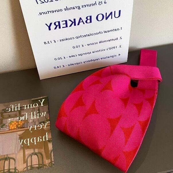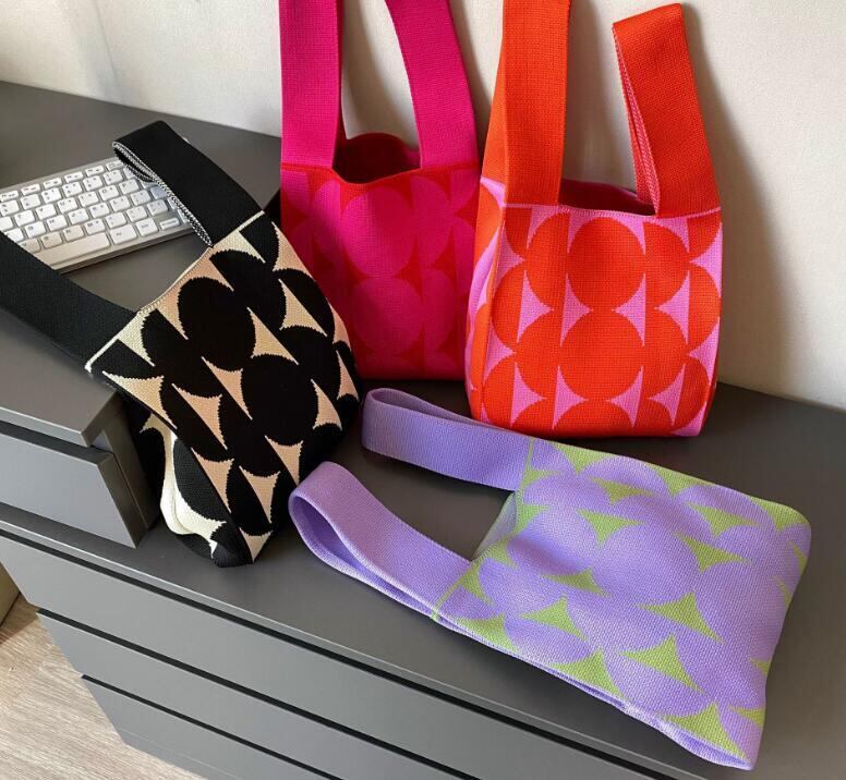 人気のニットバッグに、ジオメトリック柄が登場です。カラーリングもスタイリッシュで、アクセントにおすすめです。軽く、シワにならず、小さくまとめられて旅行先でも便利です。