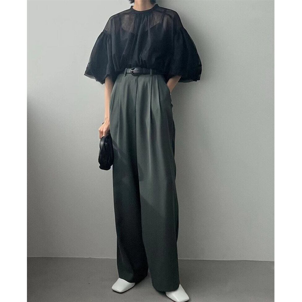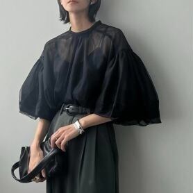 シースルー素材で涼しくおしゃれに夏を乗り切れそうな、バルーンスリーブがポイントのスタイリッシュなブラウスです。長めの丈で腰まですっきりとスマートに見せてくれます。