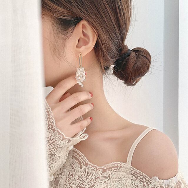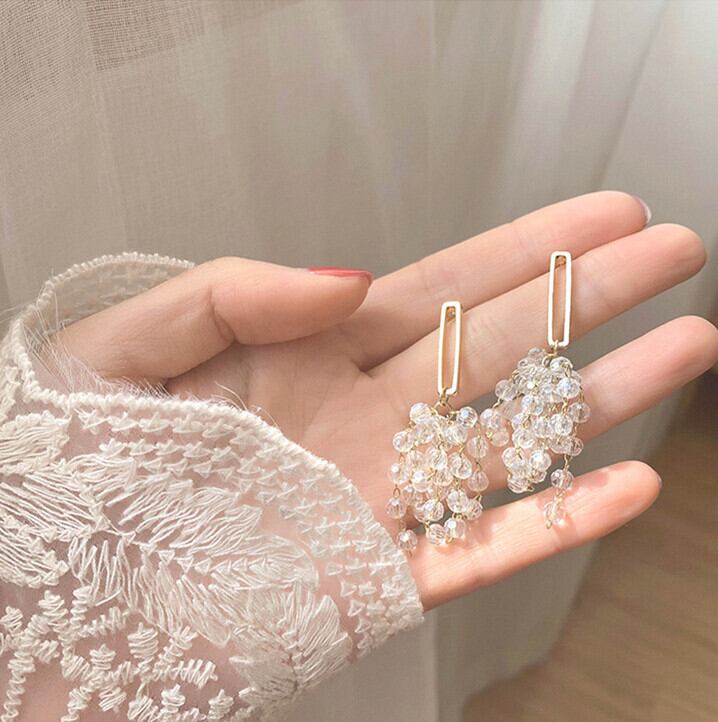 シャンデリアみたいなクリアビーズのドロップピアスです。華やかさがプラス、顔まわりが明るく見えます。コーディネートのアクセントにおすすめです。