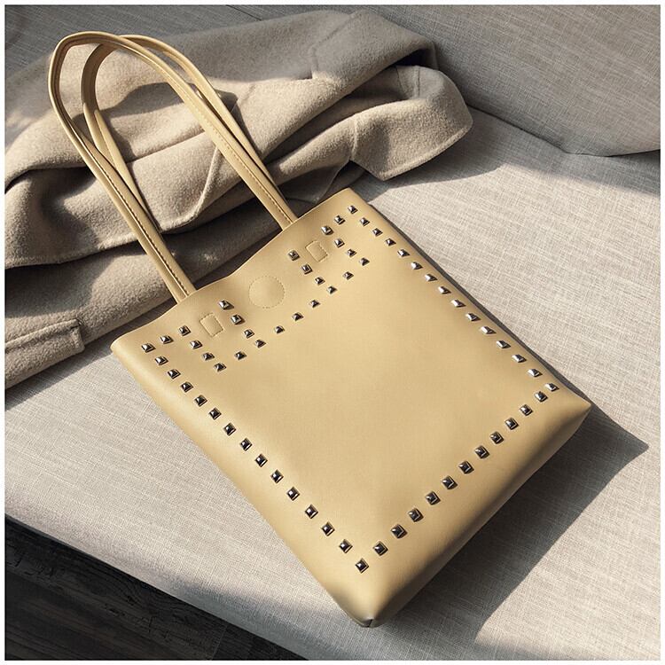 シルバーのスクエアスタッズがスタイリッシュなトートバッグ。A4サイズも入る使いやすい大きさです。カラーリングは10色展開、お気に入りのカラーが見つかります。