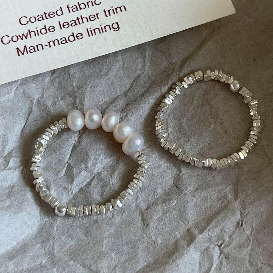 パールとシルバーのビーズをミックスしたリング2個セットです。1年を通して、幅広いコーディネートに合わせられます。フリーサイズですので、気分に合わせてお好きな指につけられます。