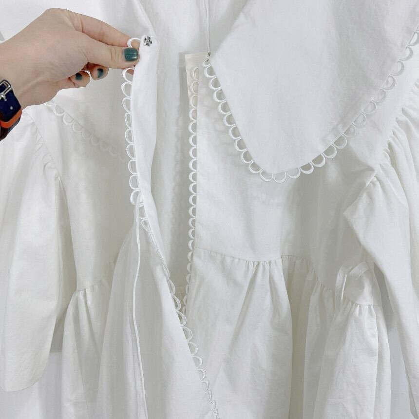 大きい衿と、衿と裾についたレースがポイントのブラウスです。カーディガンなどと合わせて、1年中スタイリングが楽しめます。パンツ、スカートどちらにも合わせやすい丈もポイントです。