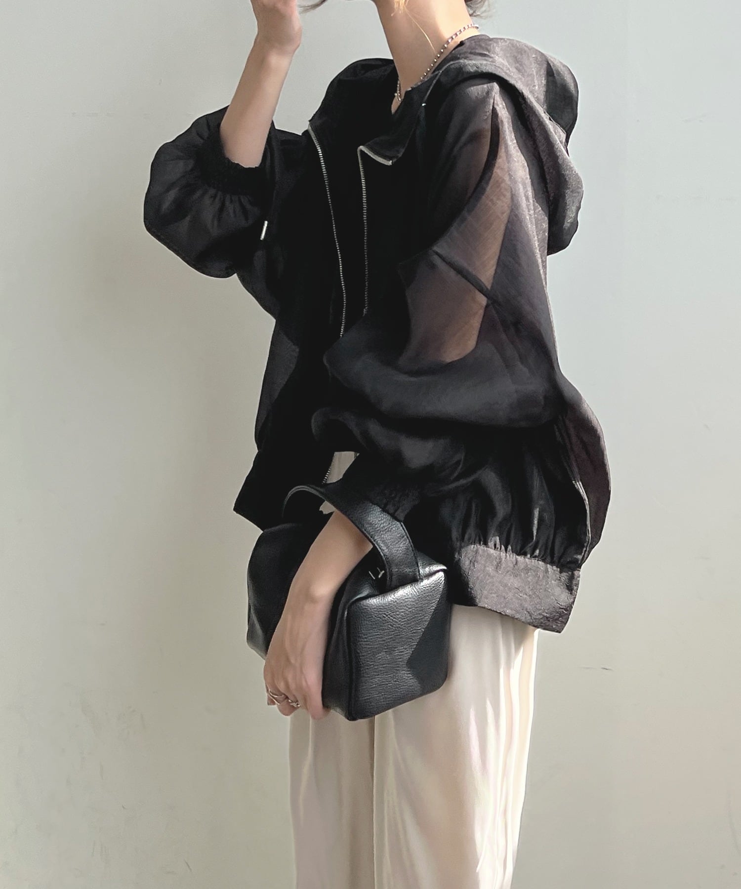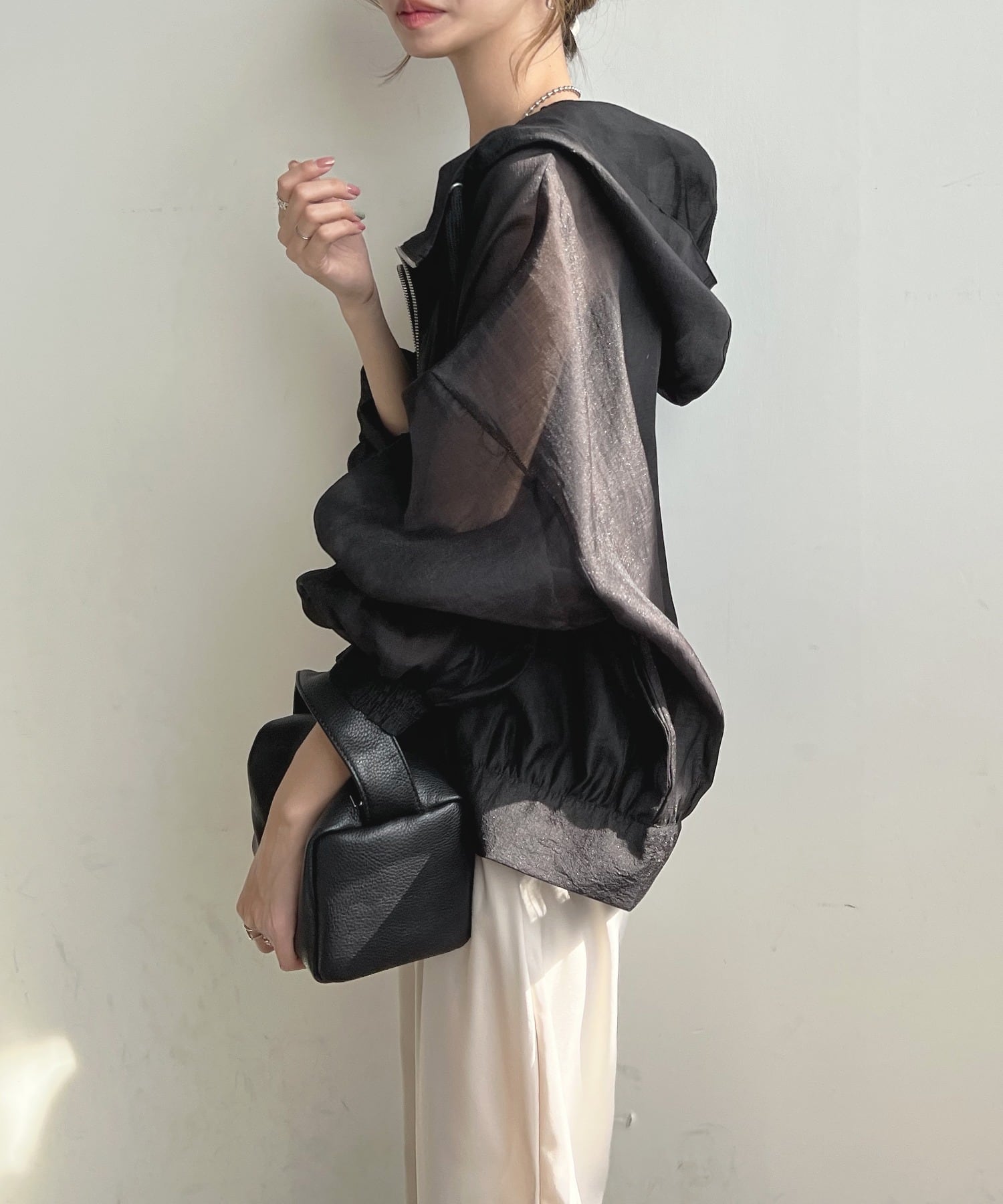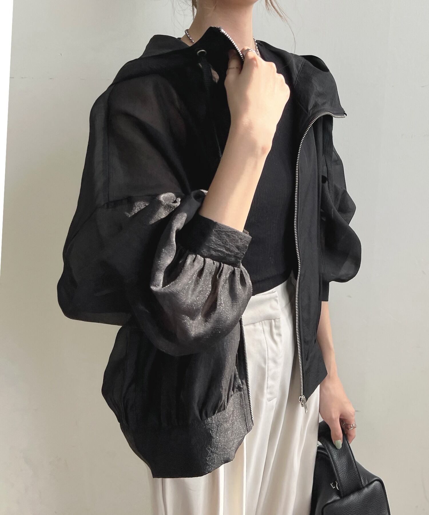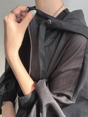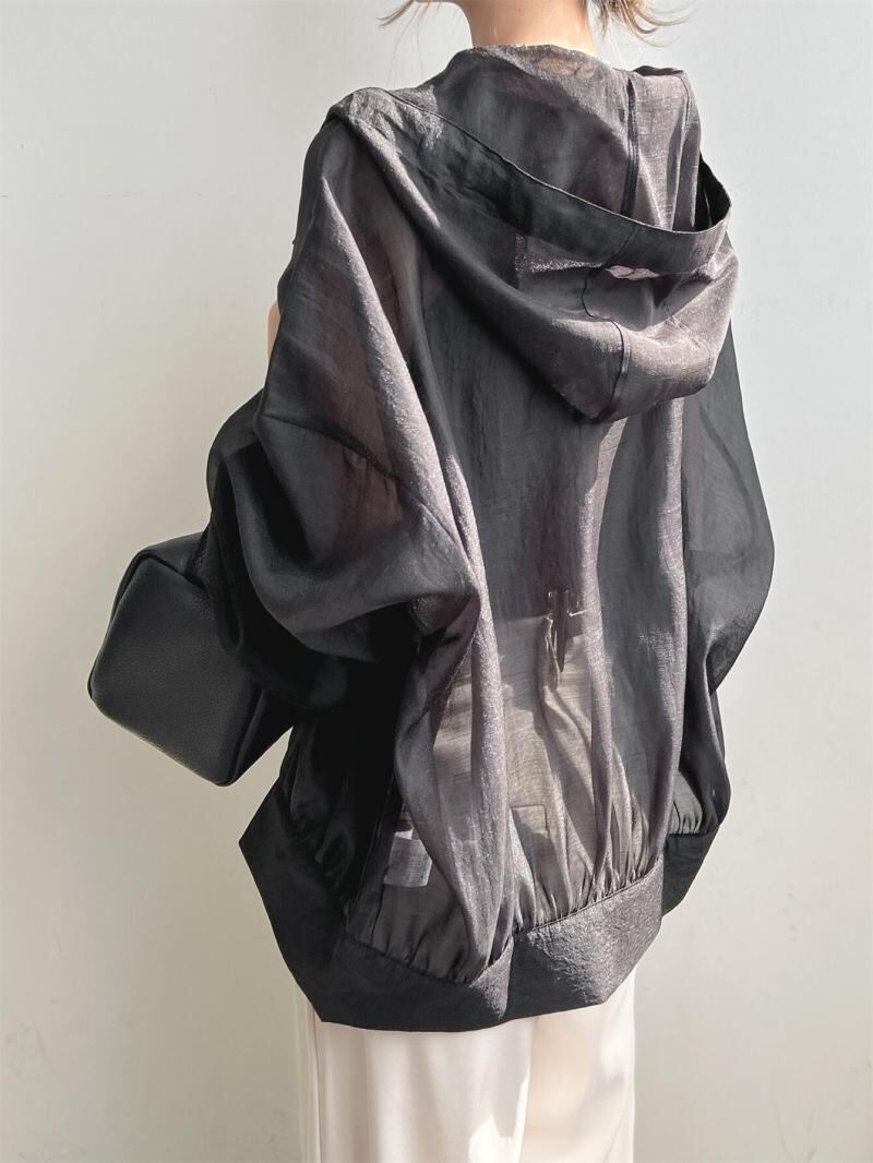 シースルー+ボリュームのあるスリーブがスタイリッシュ。トレンドのシアー素材+ショート丈で、カジュアルだけでなく、モードやエレガントなコーディネートにもスタイリングが楽しめます。フード付きで、BBQや海などアウトドアでの日焼け対策にもおすすめです◎