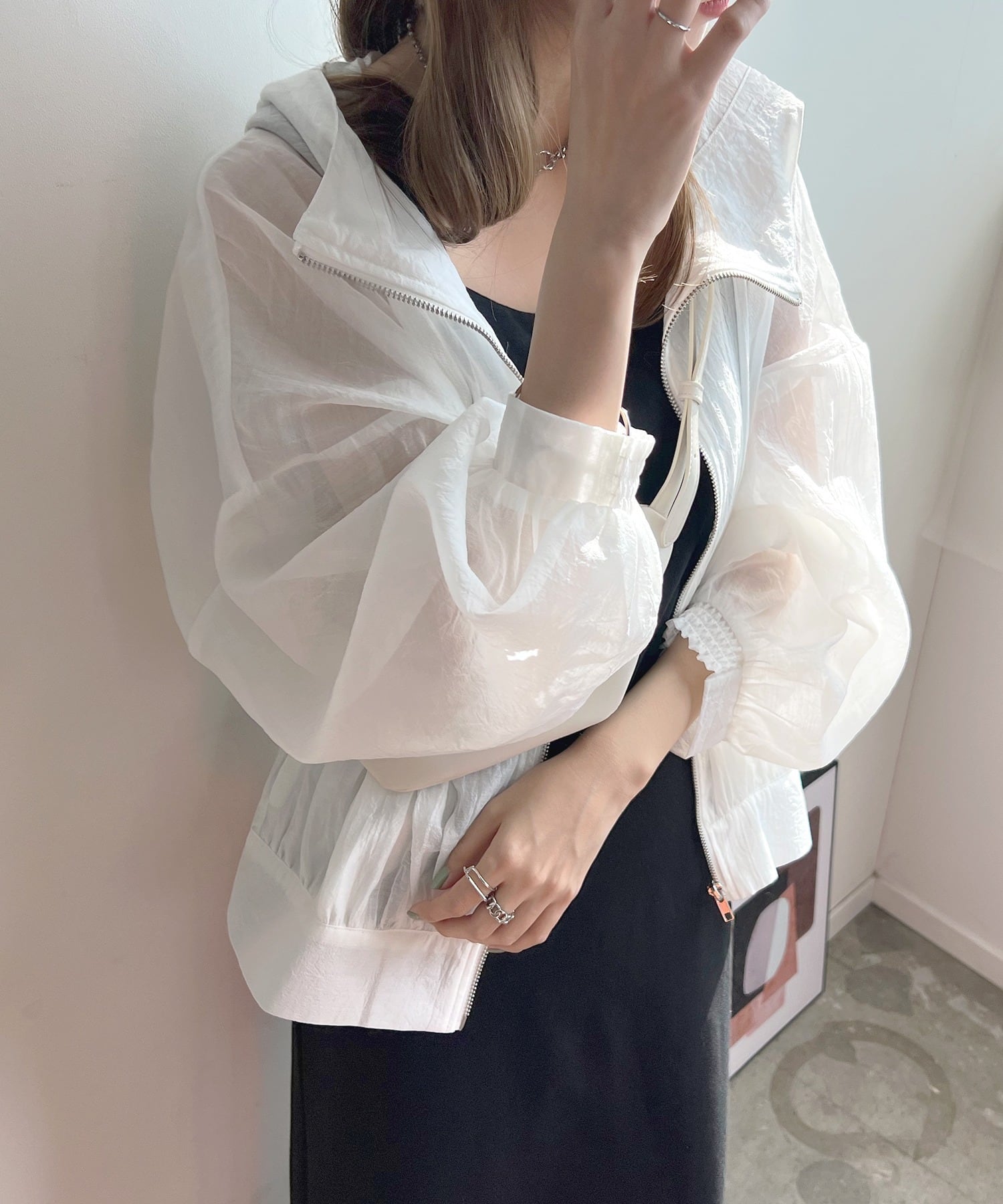 シースルー+ボリュームのあるスリーブがスタイリッシュ。トレンドのシアー素材+ショート丈で、カジュアルだけでなく、モードやエレガントなコーディネートにもスタイリングが楽しめます。フード付きで、BBQや海などアウトドアでの日焼け対策にもおすすめです◎