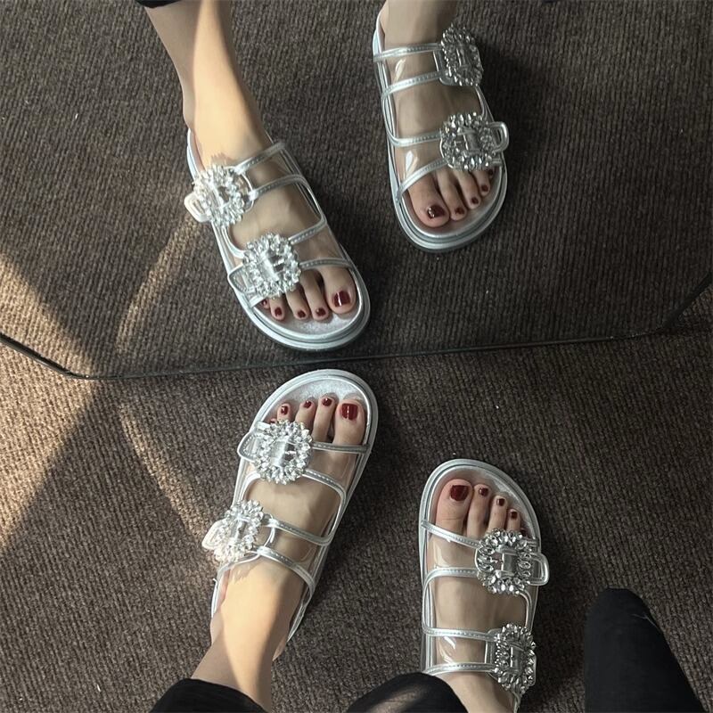 スクエアビジュー付きのコンフォートサンダルです。歩きやすく、カジュアルになりすぎないデザインが魅力です。夏のイベントに良く似合う、使いやすいサンダルです。