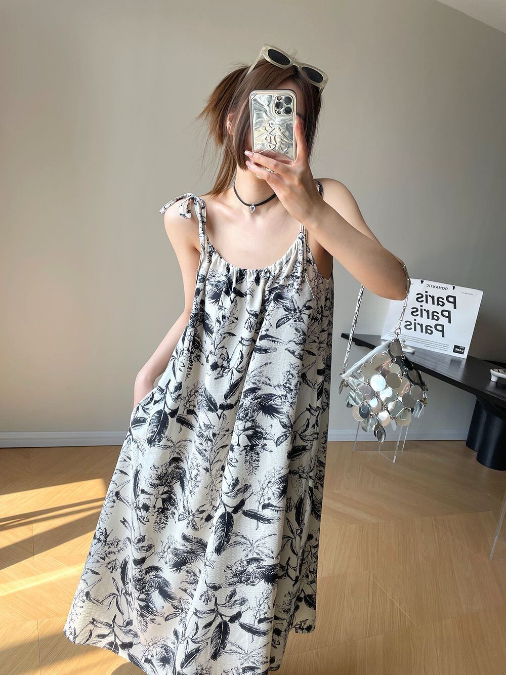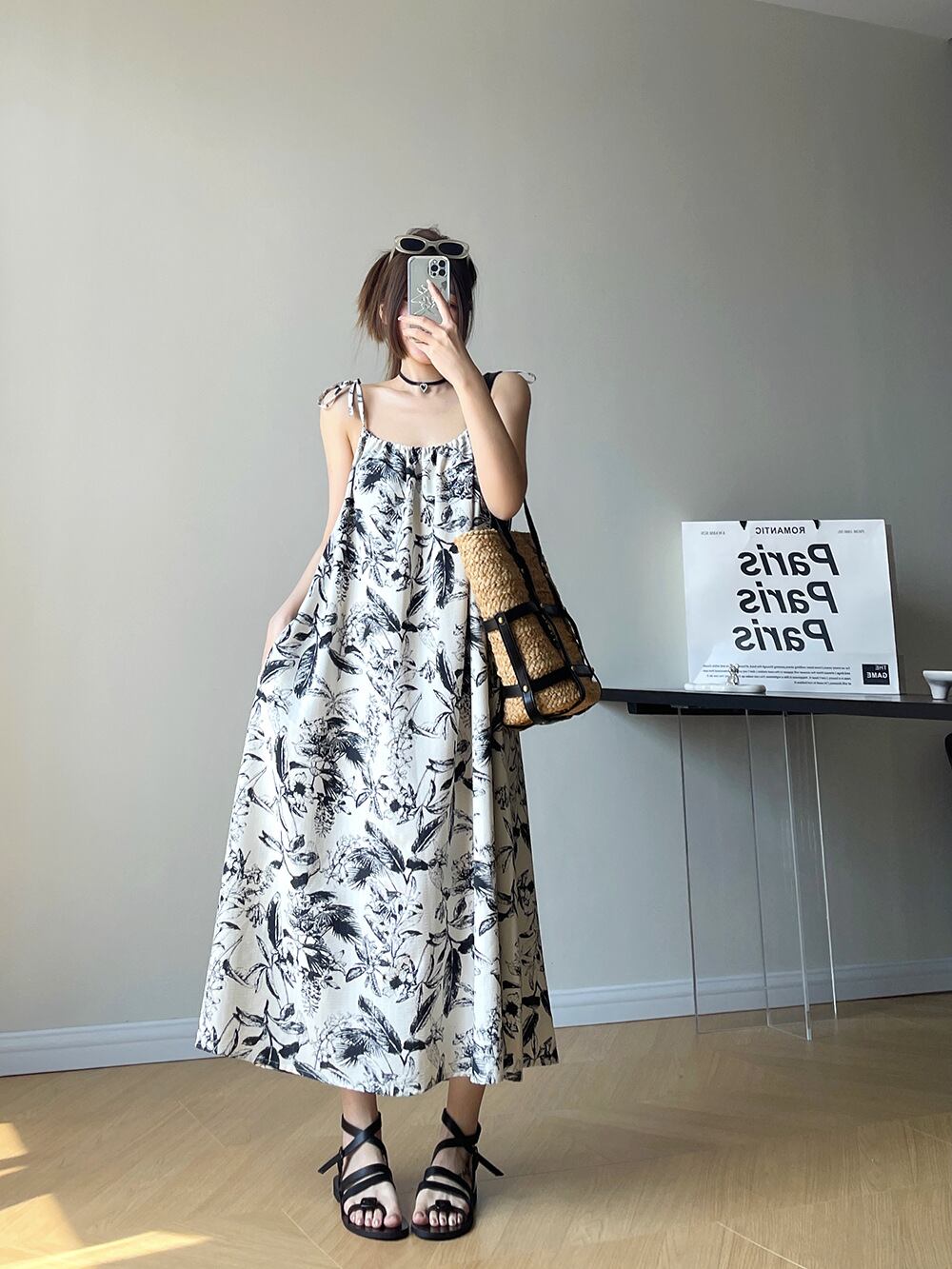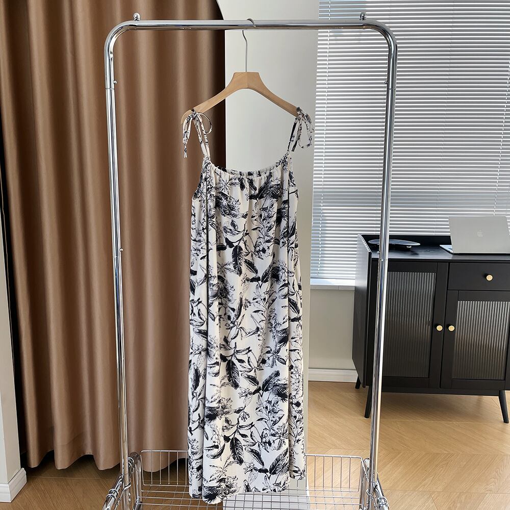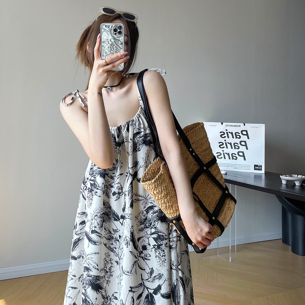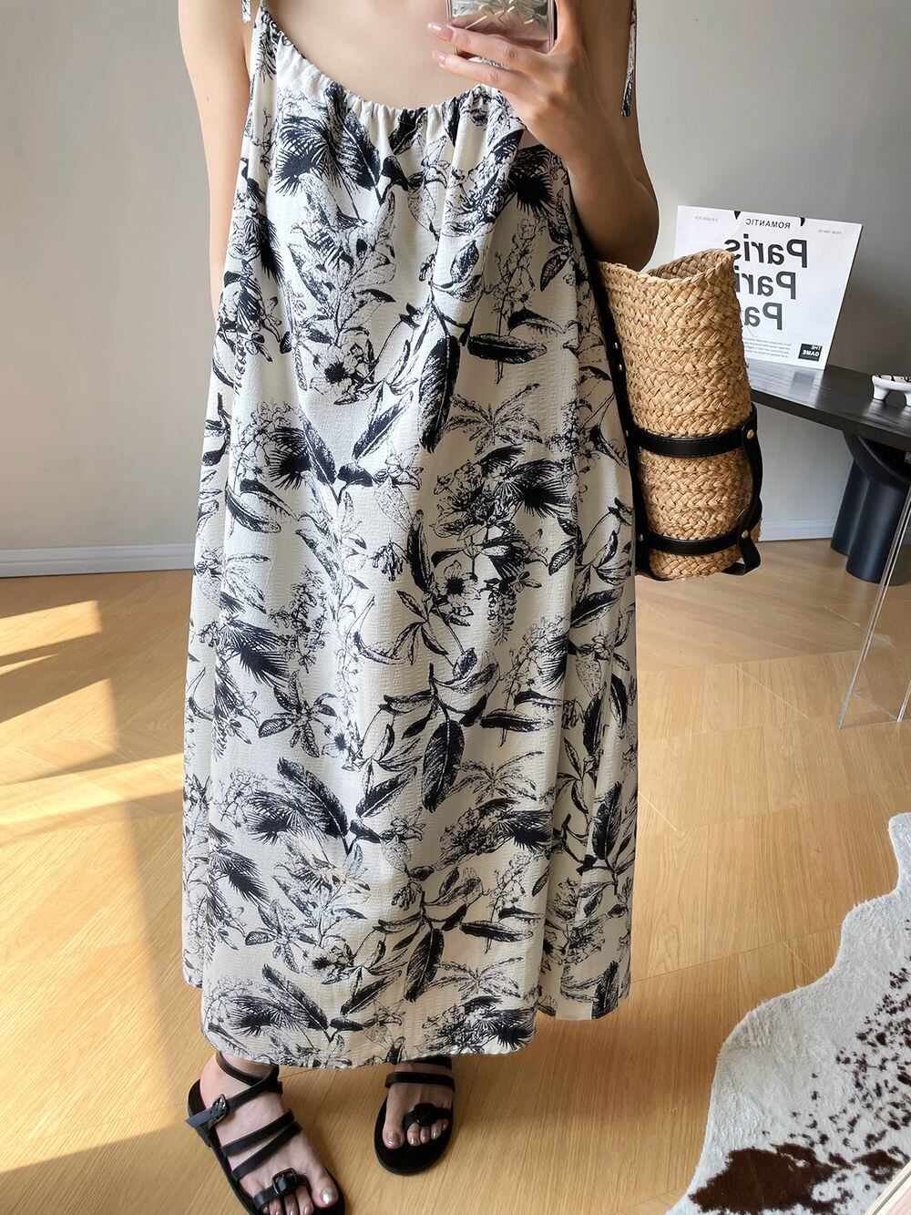 モノトーンのボタニカルプリントが爽やかなワンピースです。肩のストラップをリボンにして結ぶタイプです。ポリエステルでシワにならず、海やプールにもおすすめです。