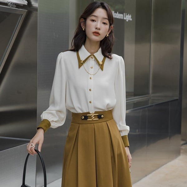バイカラー 衿チェーン付きブラウス オフホワイト/カーキ BL00054