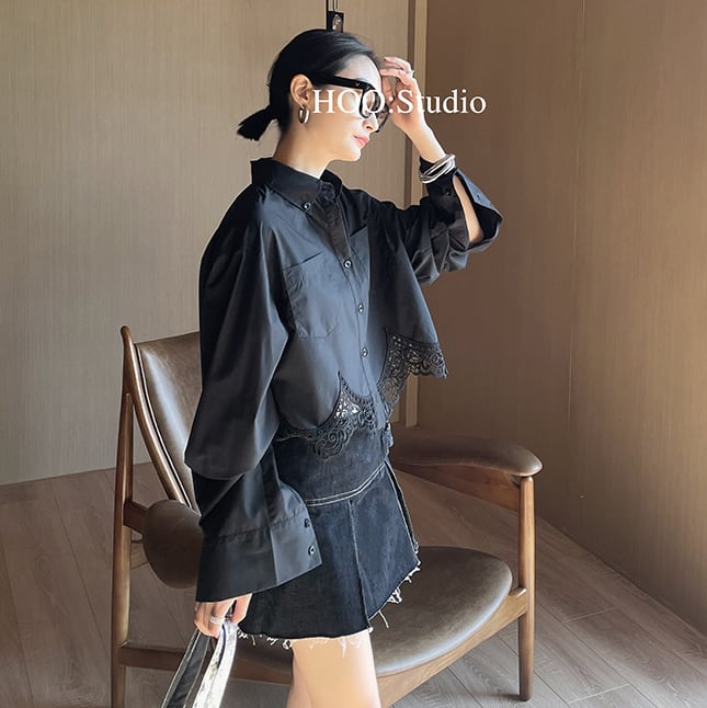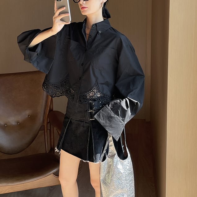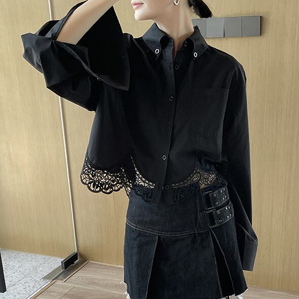 裾を飾る、フレンチレースが美しいブラウスです。ショート丈ですので、どんなボトムスとも合わせやすいです。キャミソールワンピースとのレイヤースタイリングがおすすめです。