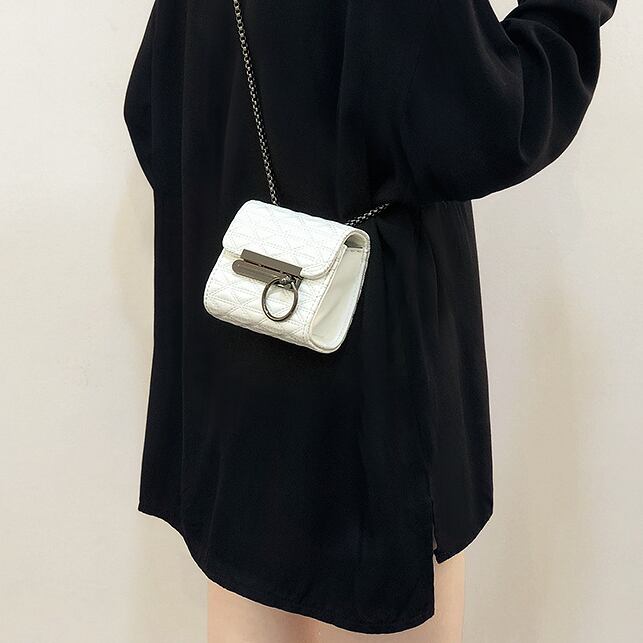 ガンメタリックのフロントロックとジオメトリックパターンが、クールな印象のチェーン付きのポシェットです。同じモデルの大きめサイズのショルダーバッグもございます。
