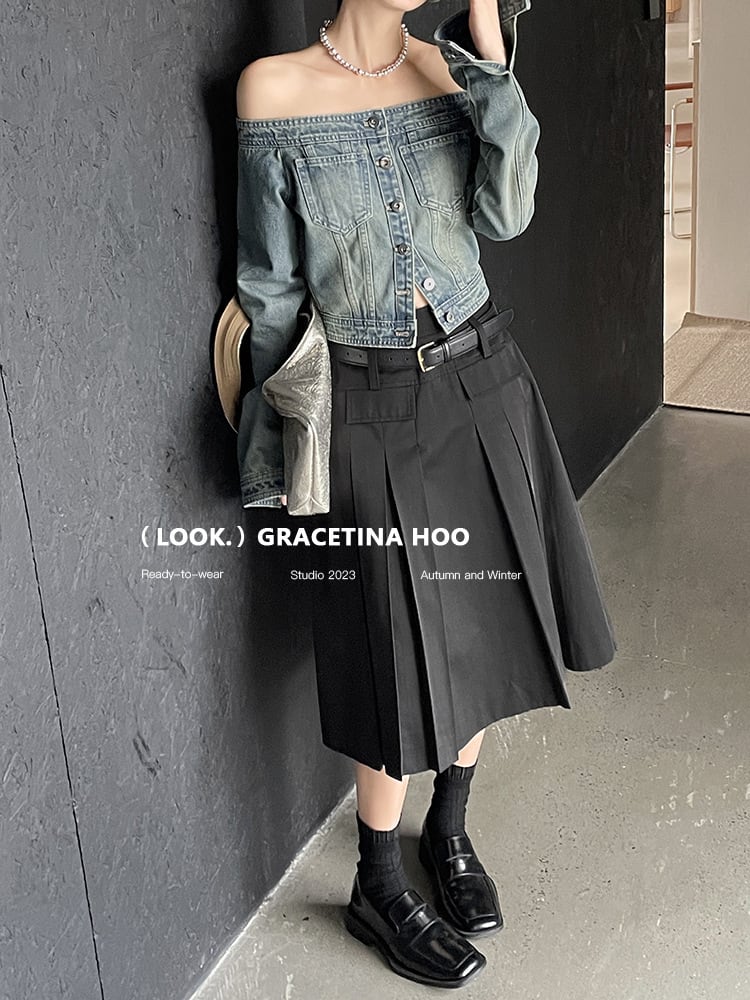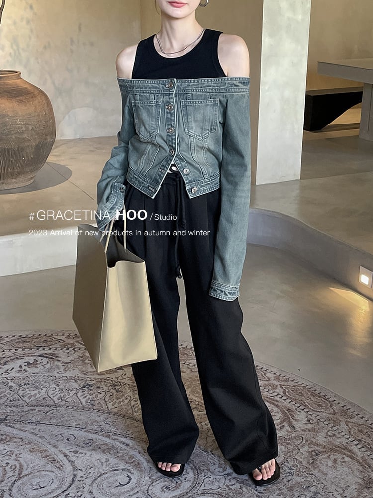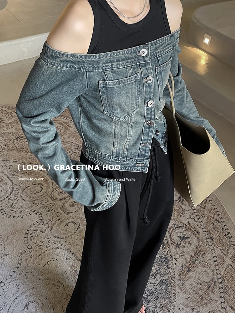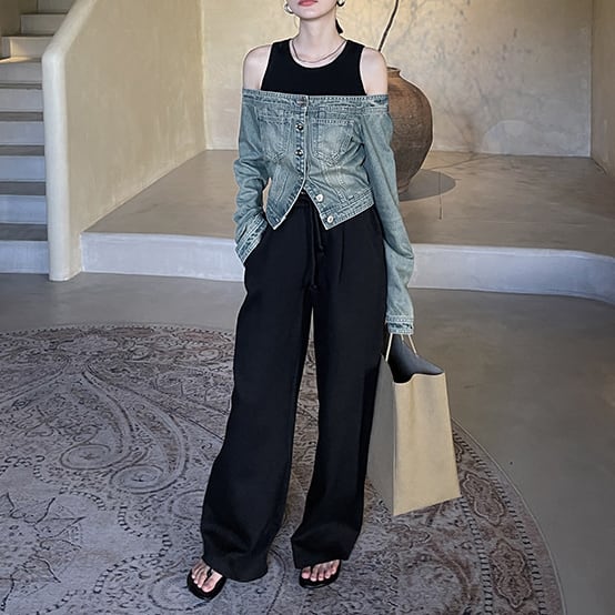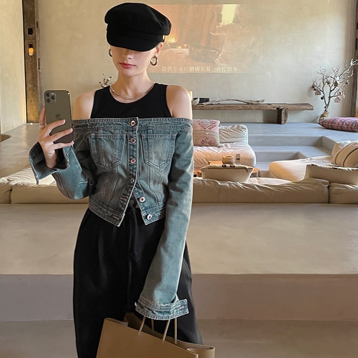 ユニークなデニムのオフショルダートップスです。キャミソールやタンクトップ、Tシャツやワンピースなど、インナー次第で、様々なスタイリングが楽しめます。そのままオフショルダートップスとしてもエレガントに着こなしが決まります!(※ブラックのインナーは付属しません。)