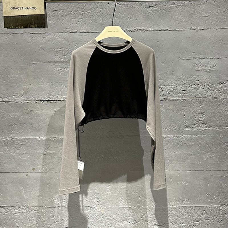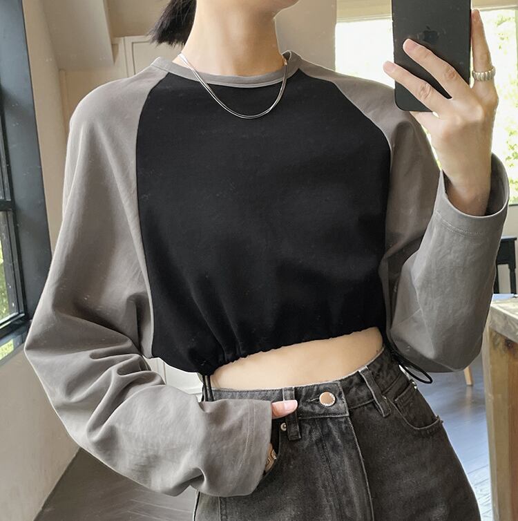 ショート丈のラグランスリーブのトップスです。ウエストのコードの絞り方でシルエットがかわります。トレンド感のある、フレッシュなスタイルに仕上がります。
