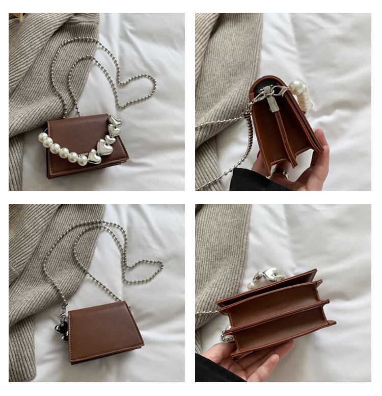 ハートのチャームとパールのハンドストラップがフェミニンなチェーンストラップ付きのポシェットです。コーディネートの可愛いアクセントにおすすめです♡