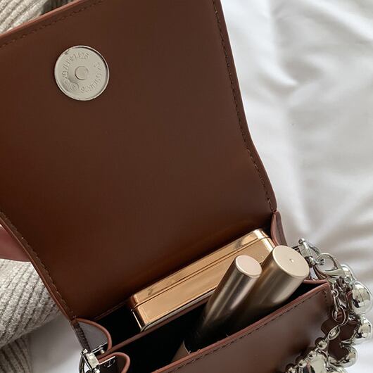ハートのチャームとパールのハンドストラップがフェミニンなチェーンストラップ付きのポシェットです。コーディネートの可愛いアクセントにおすすめです♡
