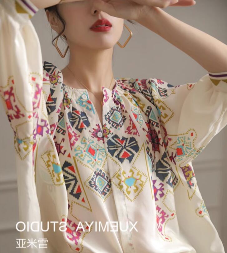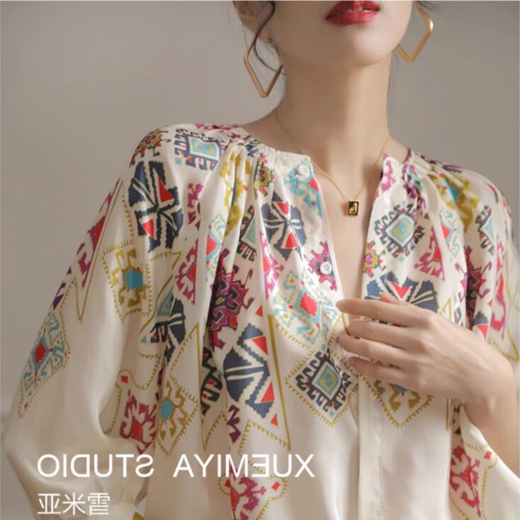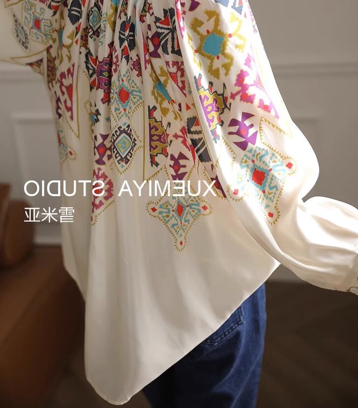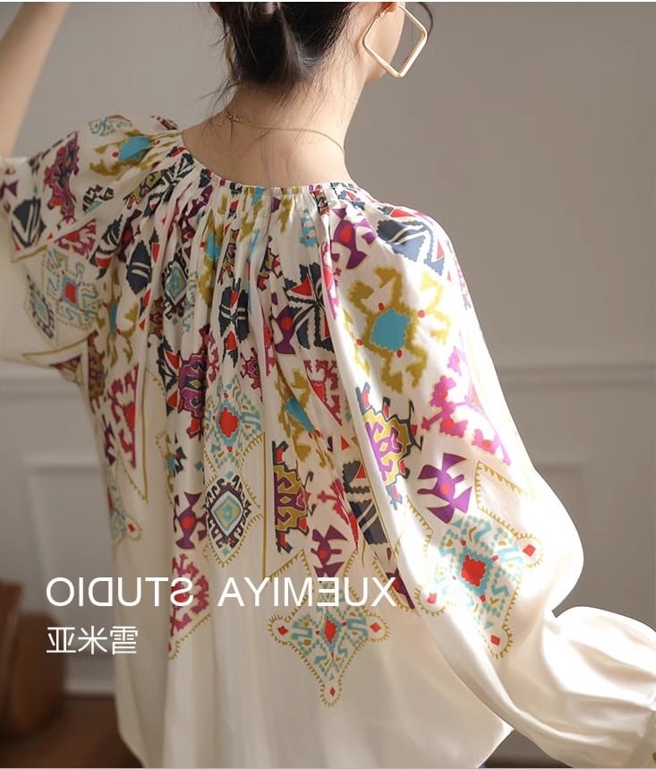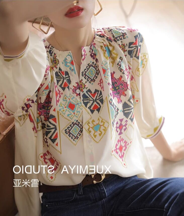 モロッコのモザイクタイルの柄「ゼリージュ」のような、美しいプリントの入ったシフォンブラウスです。後ろの裾のカッティングもエレガントなアクセントになっています。