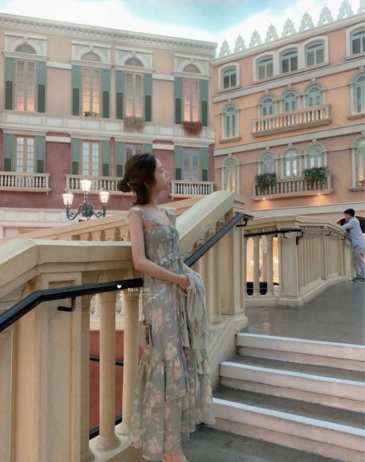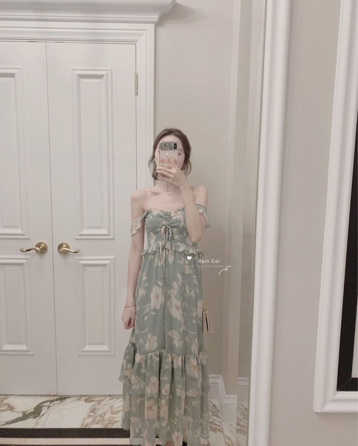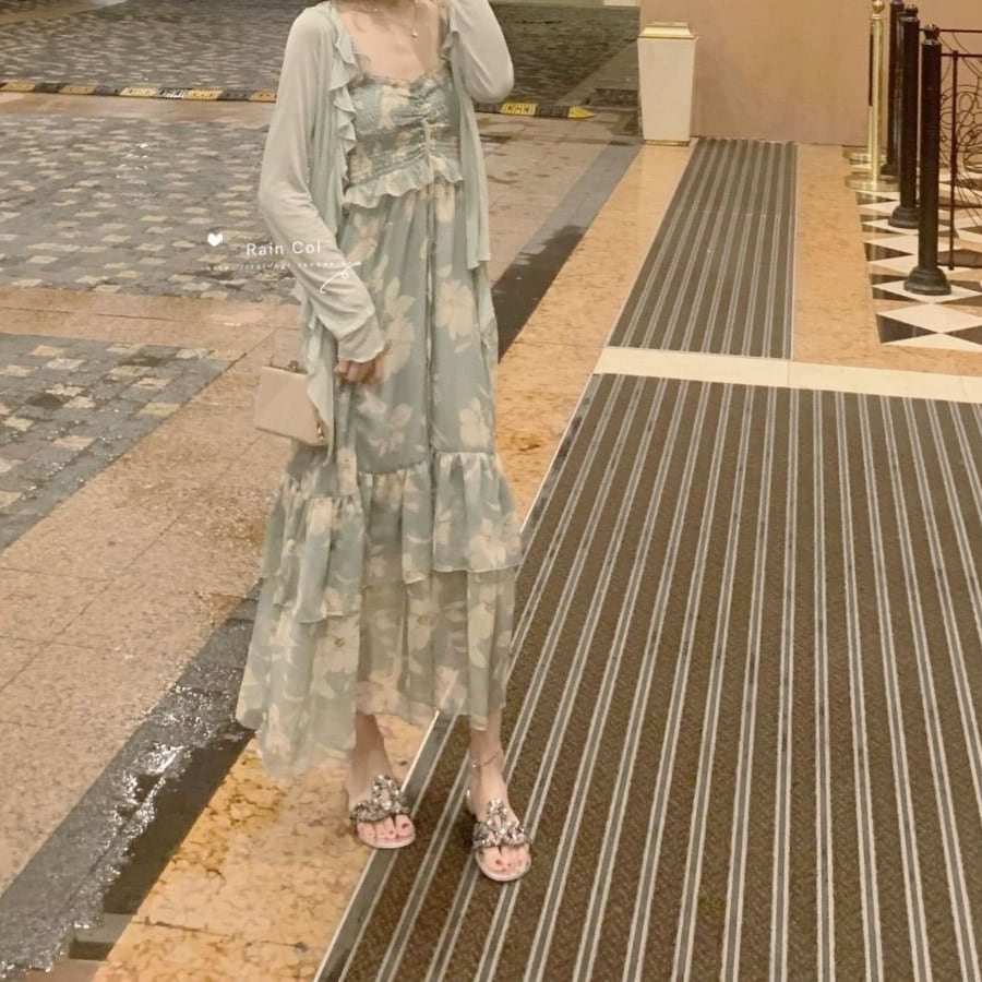 フェミニンなフラワープリントのマキシワンピースと、同系色のシアーカーディガンのセットアップです。着ている方も、見ている人も涼しくなるデザインです。