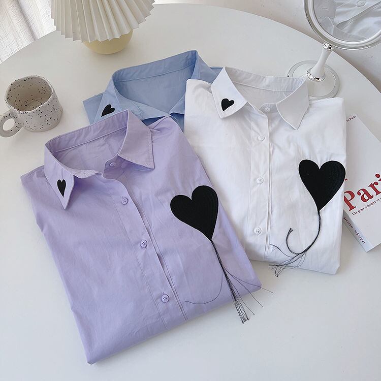 胸と衿に入ったハートのアップリケがキュートなブラウスです。ジャケットやカーディガンなどとレイヤードして、ハートをちらっとのぞかせても可愛いです。ボトムスを選ばない、スタイリングしやすいデザインです。