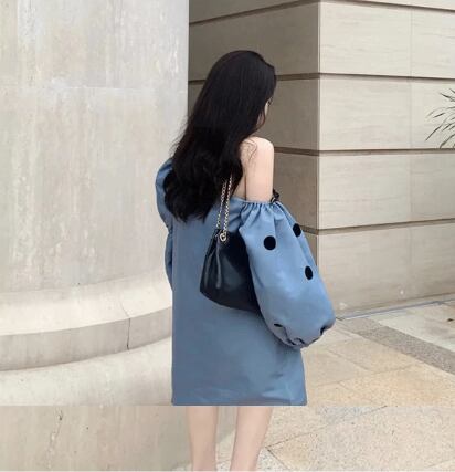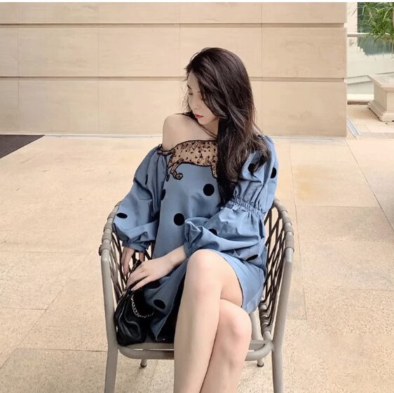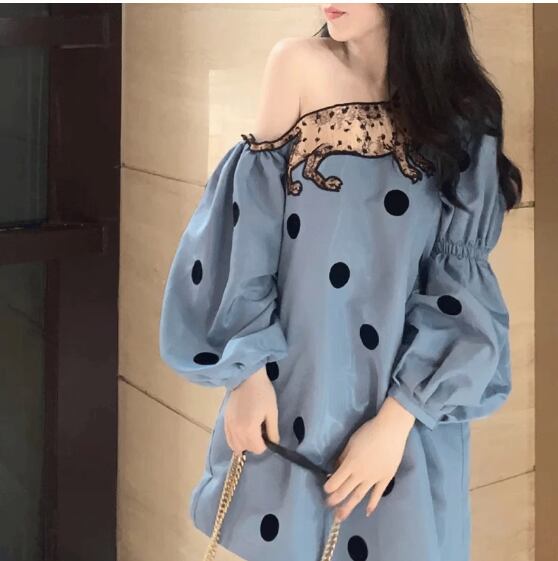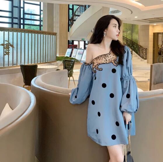 レースのレオパードがインパクトのあるワンピースです。オフショルダーにアシンメトリーな袖のデザイン、シックなブルーのドット、すべてがスタイリッシュ☆