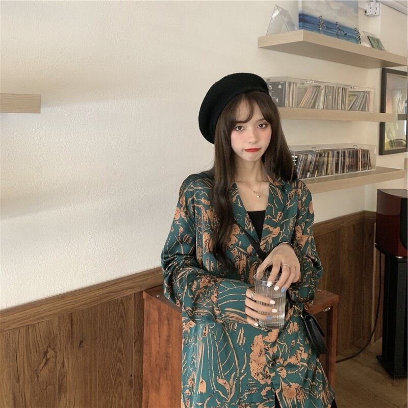 フローラルプリントの入ったダークグリーンのシャツと、ブラックのビスチェのセットアップです。それぞれ単品でも、幅広いスタイルにお使いいただけます。