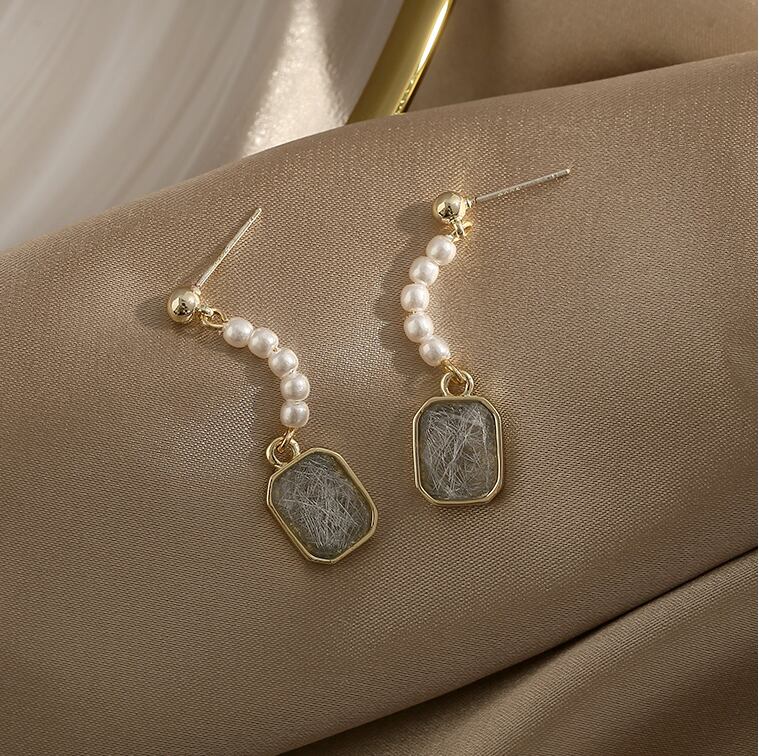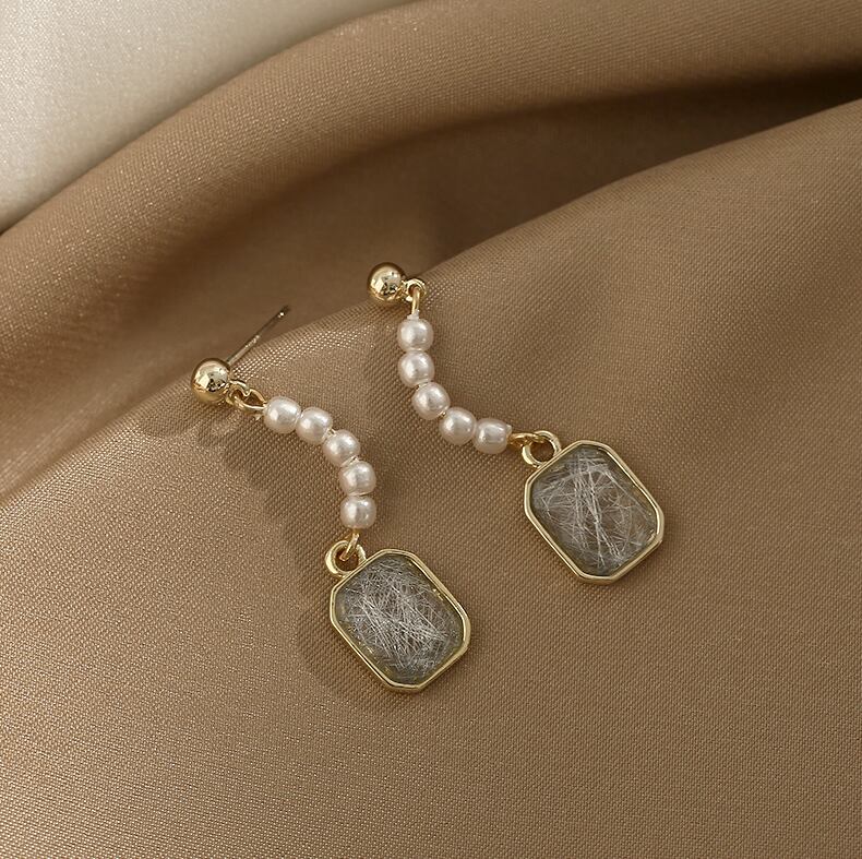 琥珀のようなチャームとパールがフェミニンなピアスです。ドロップピアスならではの揺れ感が楽しめます。スーツスタイルから、ふんわりしたニットまで良く似合います。