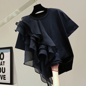 サイドのチュールのフリルがフェミニンなTシャツです。シンプルなボトムスに合わせても華やかな印象に仕上がります。ジャケットのインナーとしてもおすすめです。